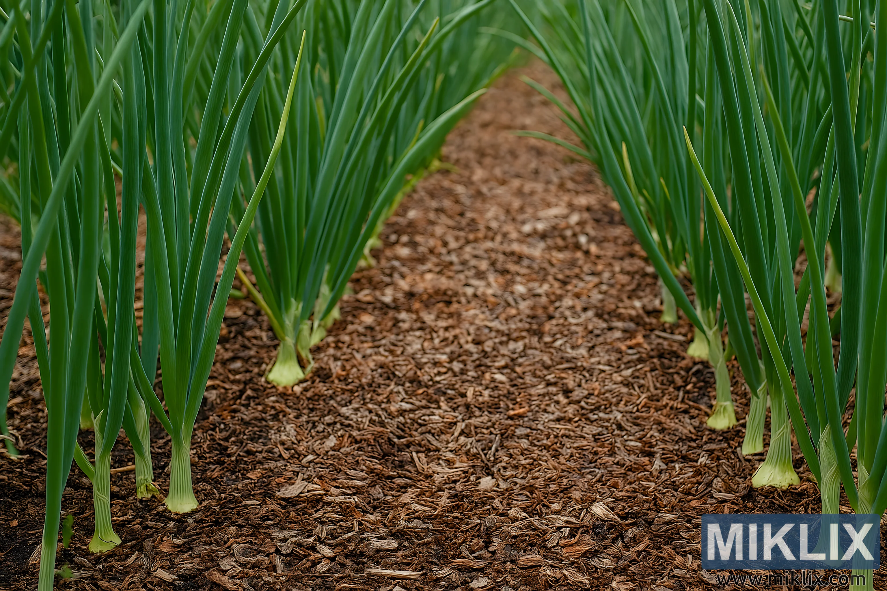 Healthy Onion Plants in Mulched Garden Rows