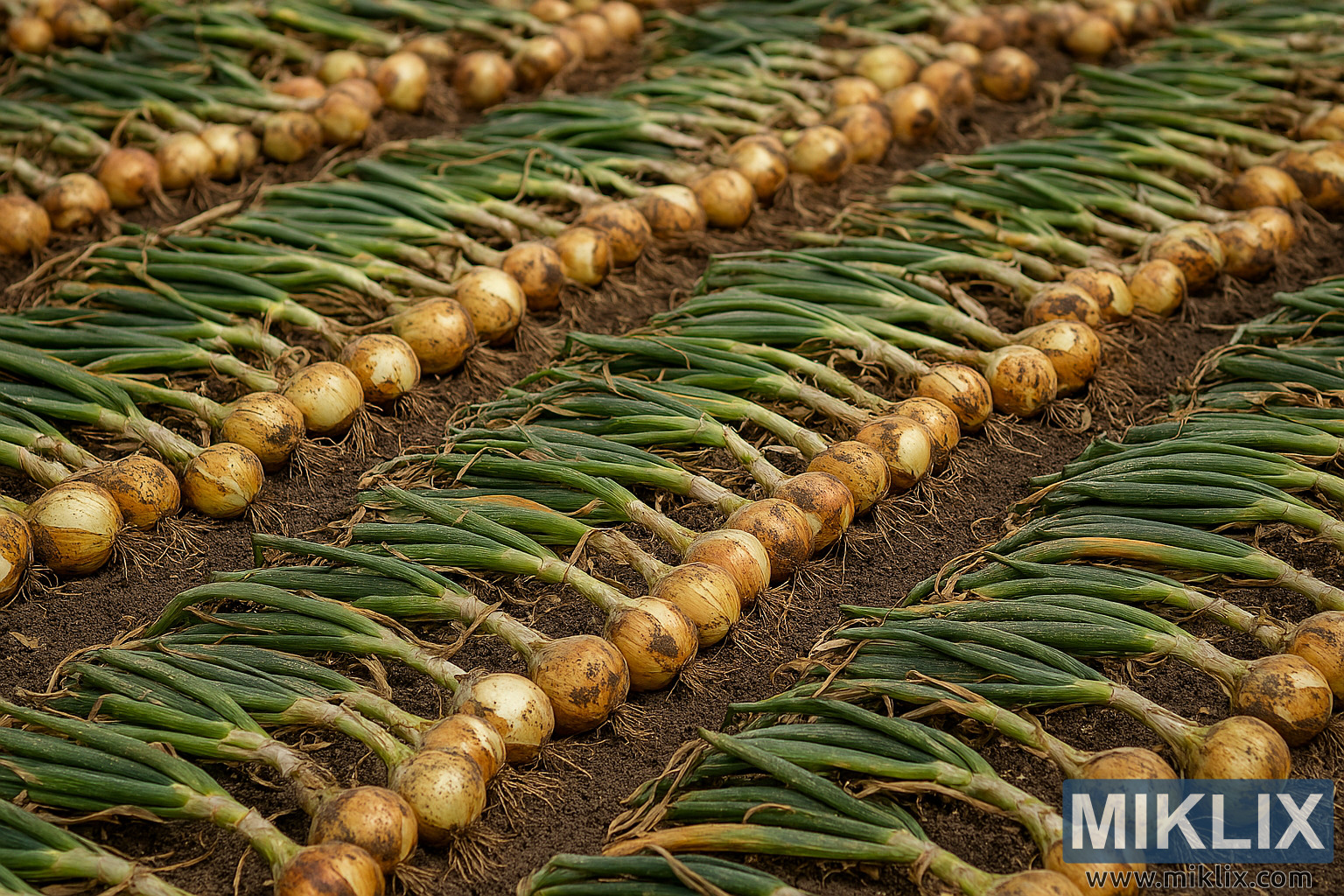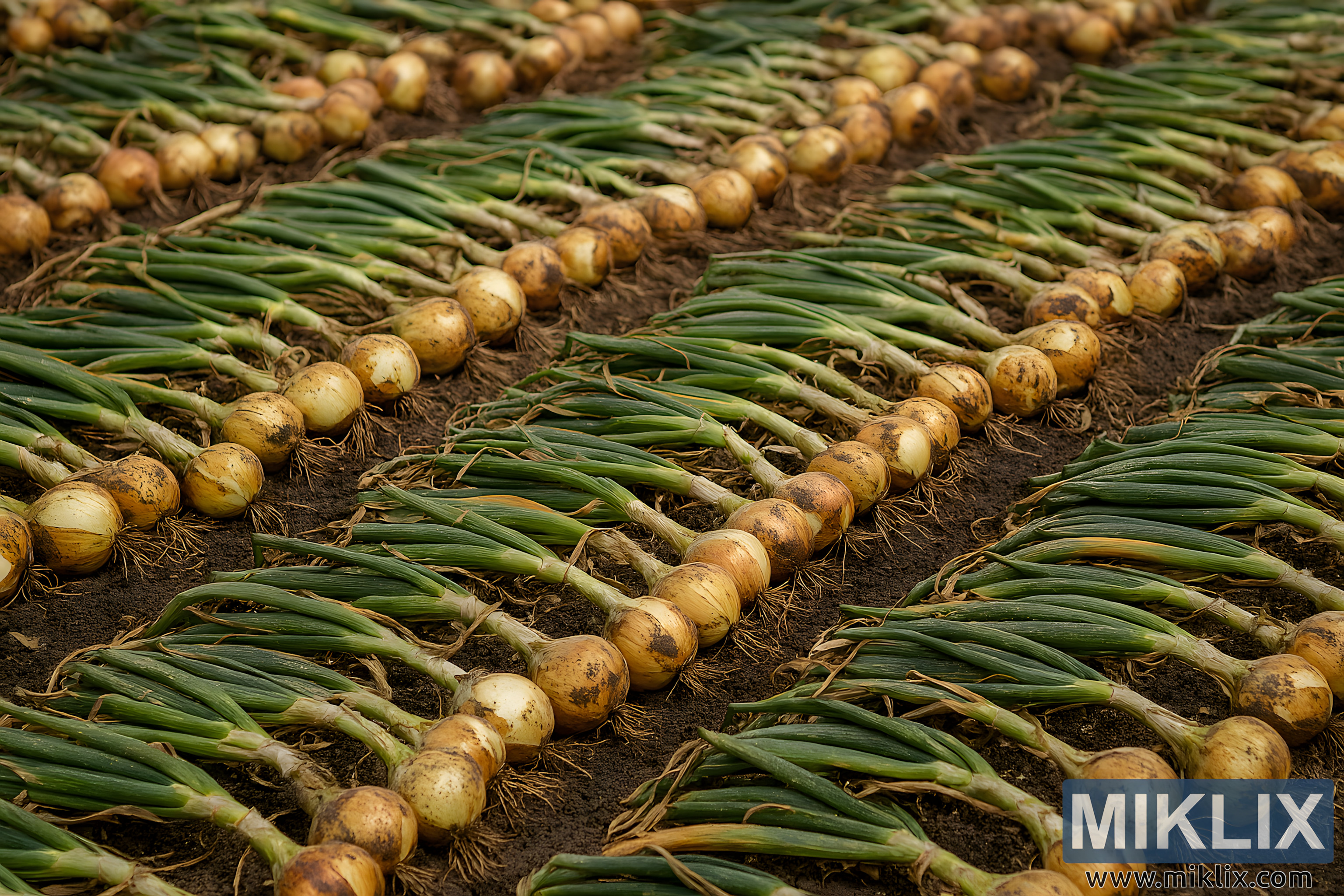 Visokoločljivostna slika sveže pobrane čebule, razporejene v vzporednih vrstah s pritrjenimi vršički, ki se suši na bogati zemlji v naravni svetlobi