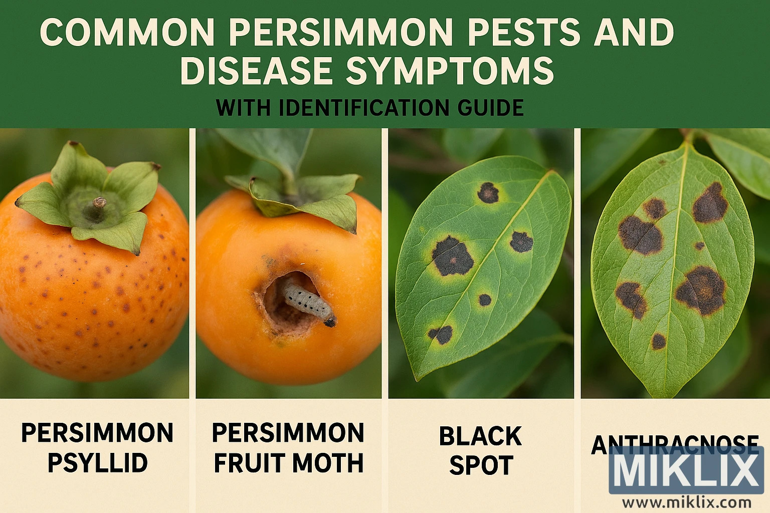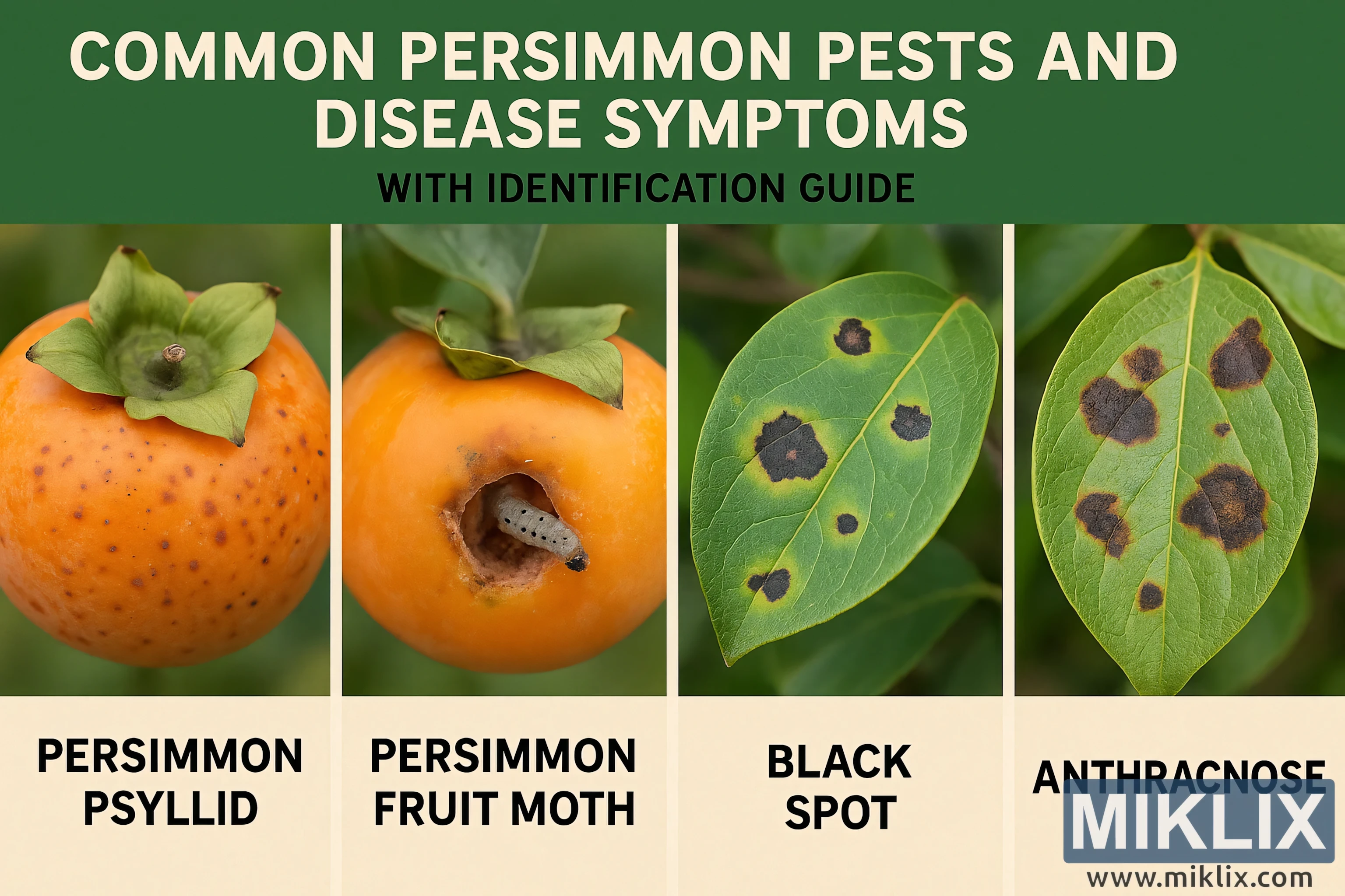 Naučite se prepoznati pogoste škodljivce in bolezni kakija s tem vizualnim vodnikom, ki vključuje kakijevega strupa, kakijevega vošča, črno pegavost in antraknozo, skupaj z označenimi slikami simptomov plodov in listov od blizu.