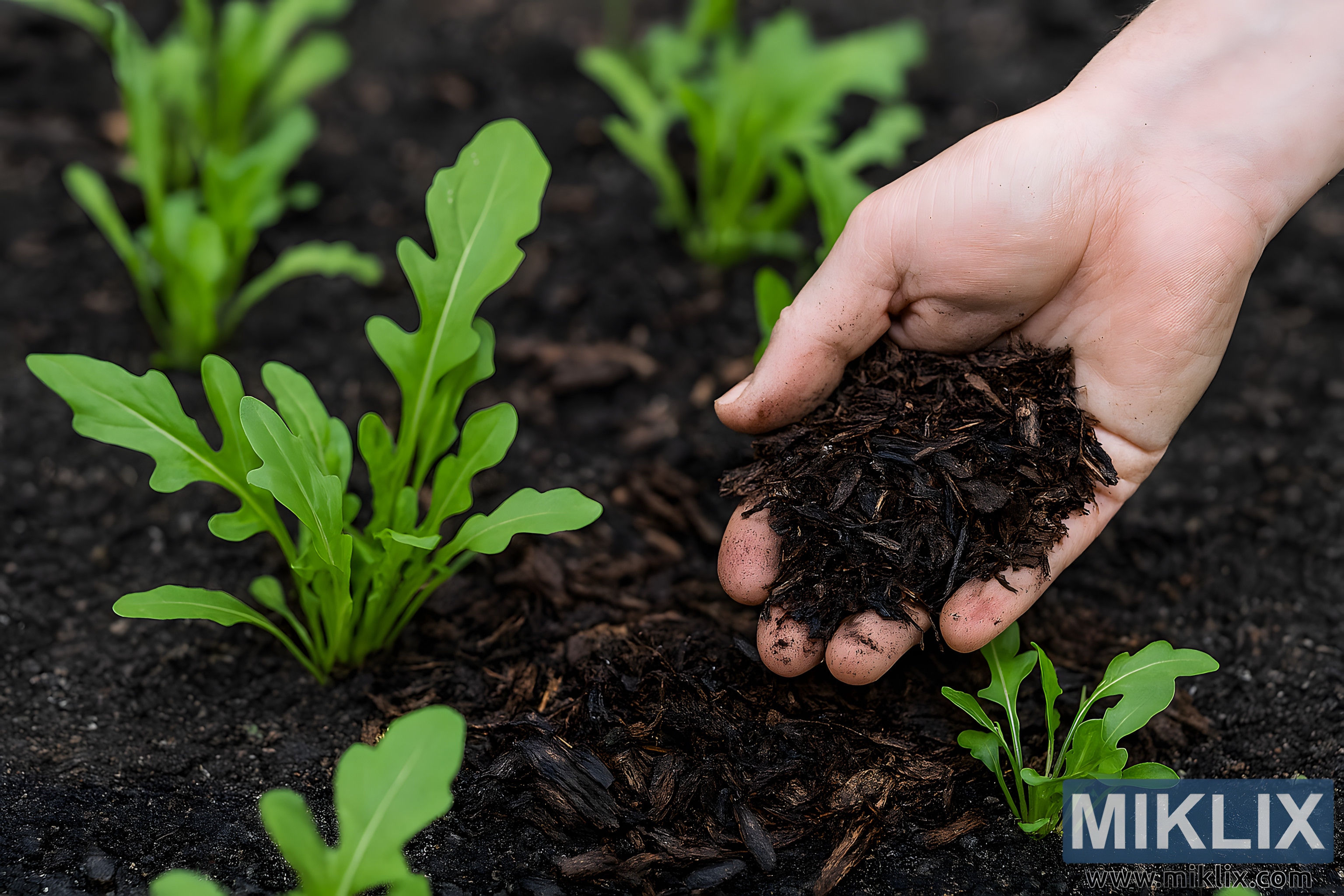 Visokoločljivostna pokrajinska fotografija ujame trenutek od blizu na vrtni gredici, kjer vrtnarjev rok nanese zastirko okoli mladih rastlin rukole. Roka, postavljena na desni strani kadra, je belopolta s svetlo poltjo, vidnimi žilami in rahlo zvitimi prsti, ki držijo pest temno rjave zastirke. Nohti so kratki in nosijo sledi zemlje, medtem ko so na prstih in dlani ostanki umazanije in organske snovi, kar poudarja taktilno naravo vrtnarjenja.