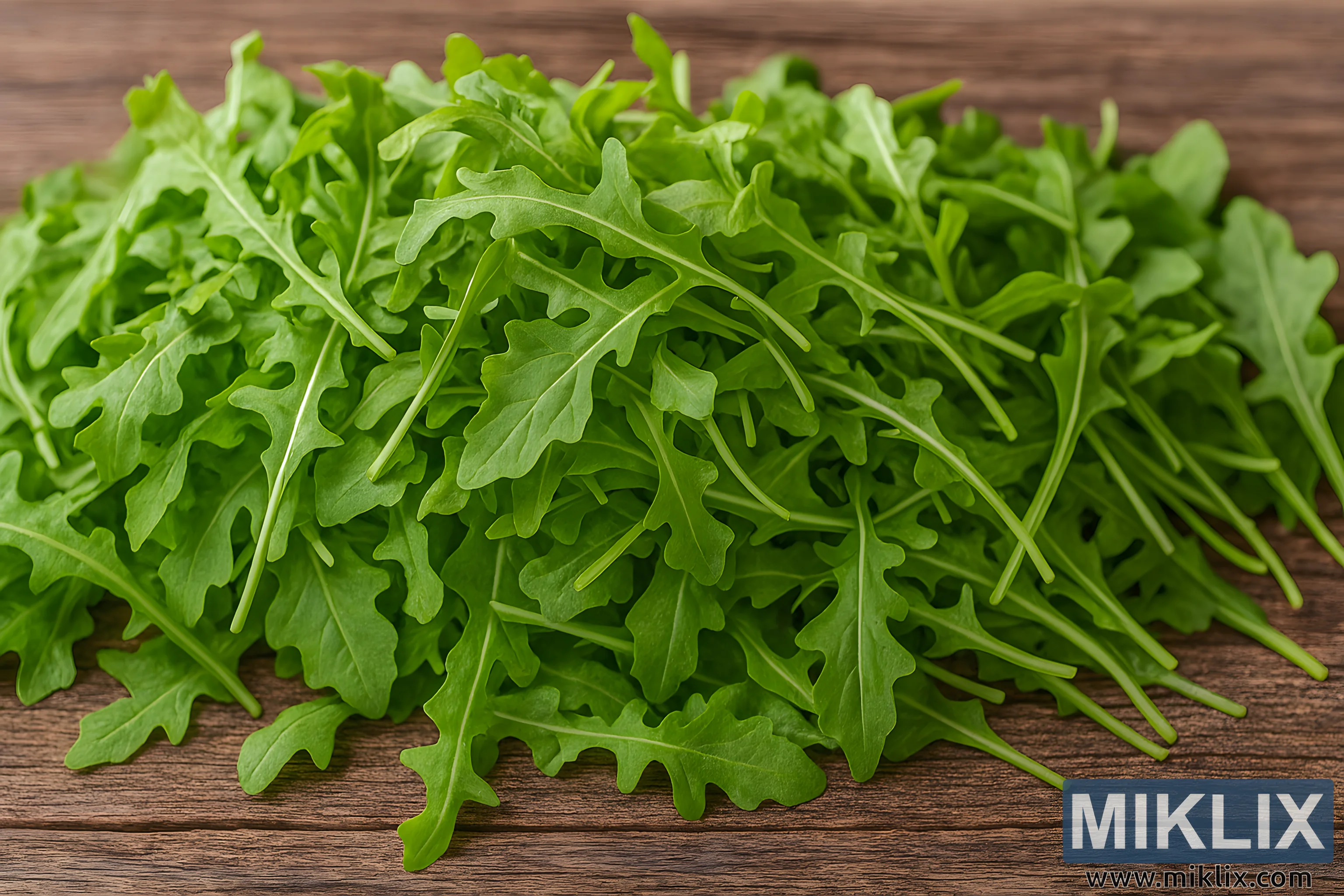 Visokoločljivostna pokrajinska fotografija prikazuje obilno letino domače rukole, sveže nabrane in umetniško aranžirane v rustikalnem vrtnem okolju. Slika prikazuje obilen kup živahnih zelenih listov rukole, ki se razsipajo iz pletenih košar na obrabljeno leseno mizo. Vsak list ima značilno krpasto in nazobčano obliko rukole, z nežnimi spremembami v ukrivljenosti in velikosti, ki odražajo naravno rast. Listi segajo od temno smaragdne do svetlejše limetino zelene barve, z nežnimi žilami, ki se razvejajo od osrednjega rebra proti robovom.