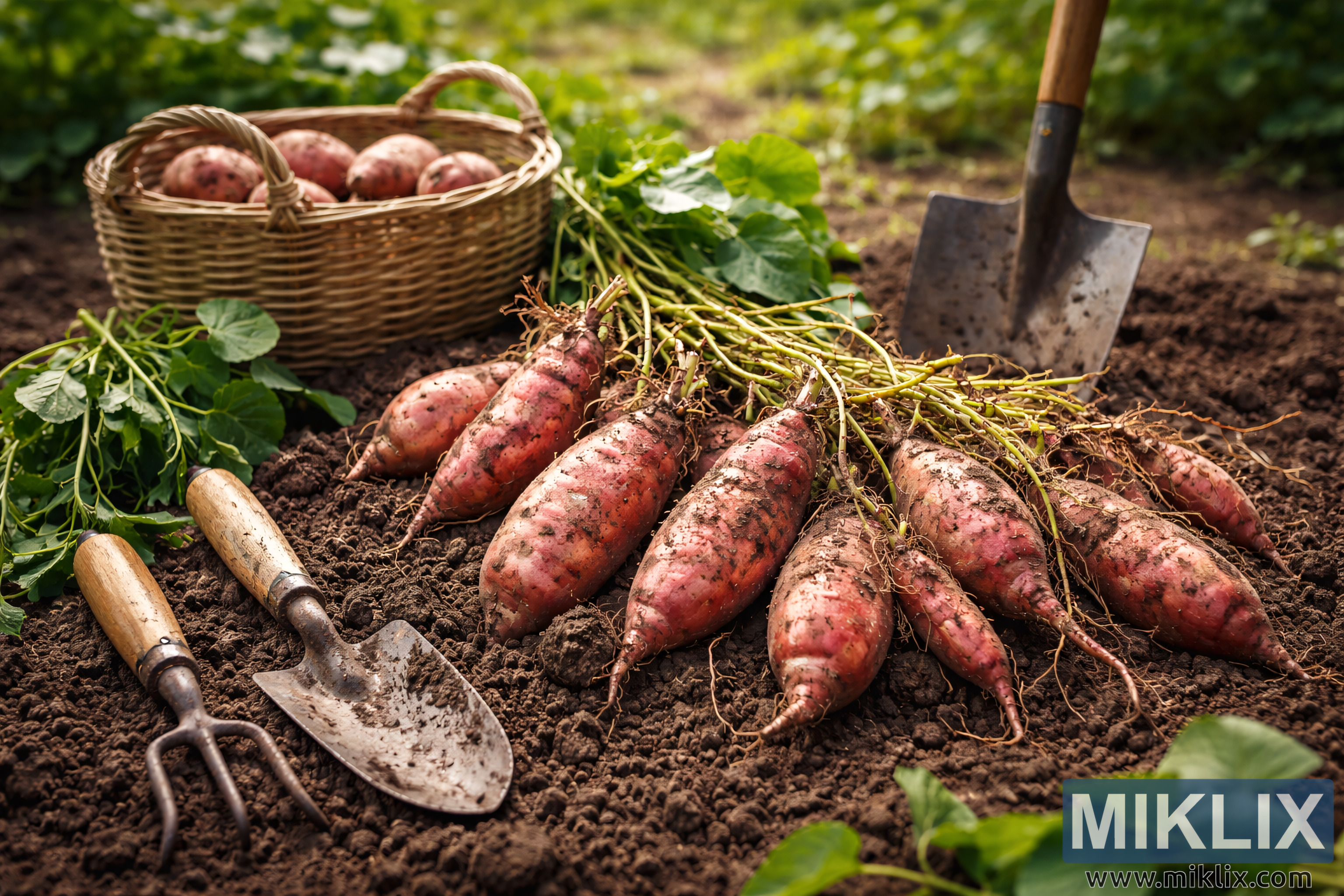 Fotografija visoke ločljivosti sveže pobranega sladkega krompirja, položenega na vrtno zemljo poleg ročnega orodja in pletene košare, ki ujame naravni prizor žetve na prostem.