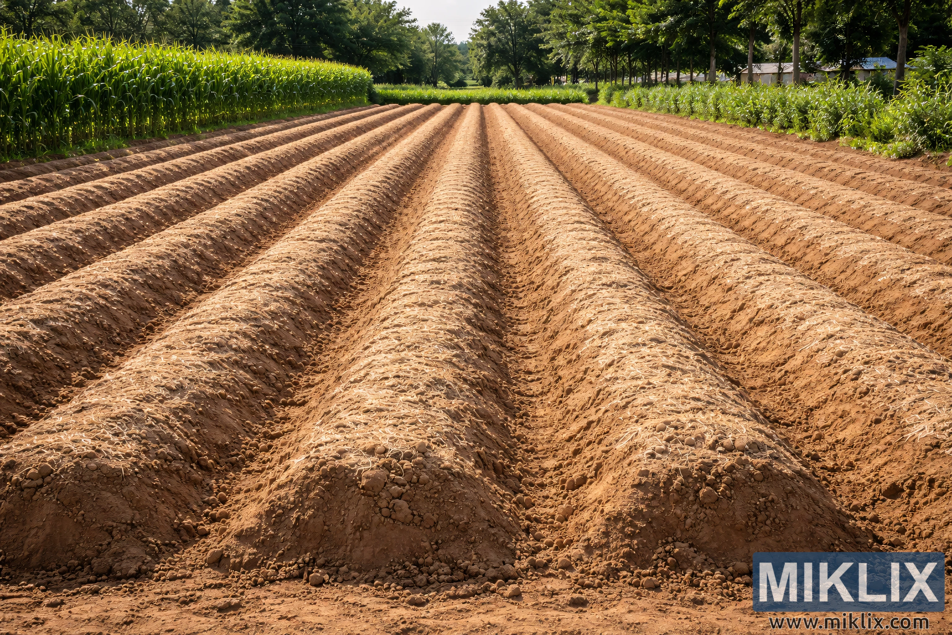Slika prikazuje široko kmetijsko polje, pripravljeno za sajenje sladkega krompirja, fotografirano v ležeči orientaciji z močnim občutkom globine in perspektive. V ospredju in daleč v daljavo se raztezajo enakomerno razporejeni dvignjeni grebeni sveže obdelane zemlje. Vsak greben je dolg, gladek in nežno zaobljen, z rahljo, drobljivo zemljo, ki kaže jasne znake nedavne obdelave. Grebeni potekajo vzporedno drug z drugim in ustvarjajo ritmičen vzorec izmeničnih dvignjenih gredic in plitvih brazd, ki usmerjajo gledalčev pogled proti obzorju. Tla so topla, zemeljsko rjava, na površini osvetljena in suha, z nežnimi spremembami v teksturi, kjer svetlobo lovijo majhne grude in drobni delci. Skrbno oblikovanje grebenov kaže na namerno pripravo na sajenje sladkega krompirja, kar omogoča pravilno drenažo, širjenje korenin in enostavno gojenje. Na obeh straneh polja prizor uokvirja zeleno rastlinje. Na levi strani gost nasad visokih, listnatih poljščin – morda koruze ali drugega žita – tvori živahno zeleno steno, ki je v kontrastu z rjavo zemljo. Na desni mešani grmičevje in nižje rastline dodajajo teksturo in vizualno ravnovesje. V ozadju se ob robu polja razprostirajo zrela drevesa s polnimi zelenimi krošnjami, kar kaže na podeželsko ali polpodeželsko kmečko okolje. Za drevesi so vidni šibki obrisi kmetijskih poslopij ali lopov, ki se naravno zlivajo s pokrajino, ne da bi prevladovali v prizoru. Nebo nad glavo je jasno in svetlo, kar nakazuje sončen dan z ugodnim vremenom za sajenje. Osvetlitev je naravna in enakomerna, poudarja obrise grebenov in krepi občutek urejenosti in pripravljenosti na polju. Na splošno slika izraža skrbno pripravo zemlje, kmetijsko znanje in pričakovanje nove rastne sezone, s poudarkom na strukturi, produktivnosti in harmoniji med obdelano zemljo in okoliško naravo.