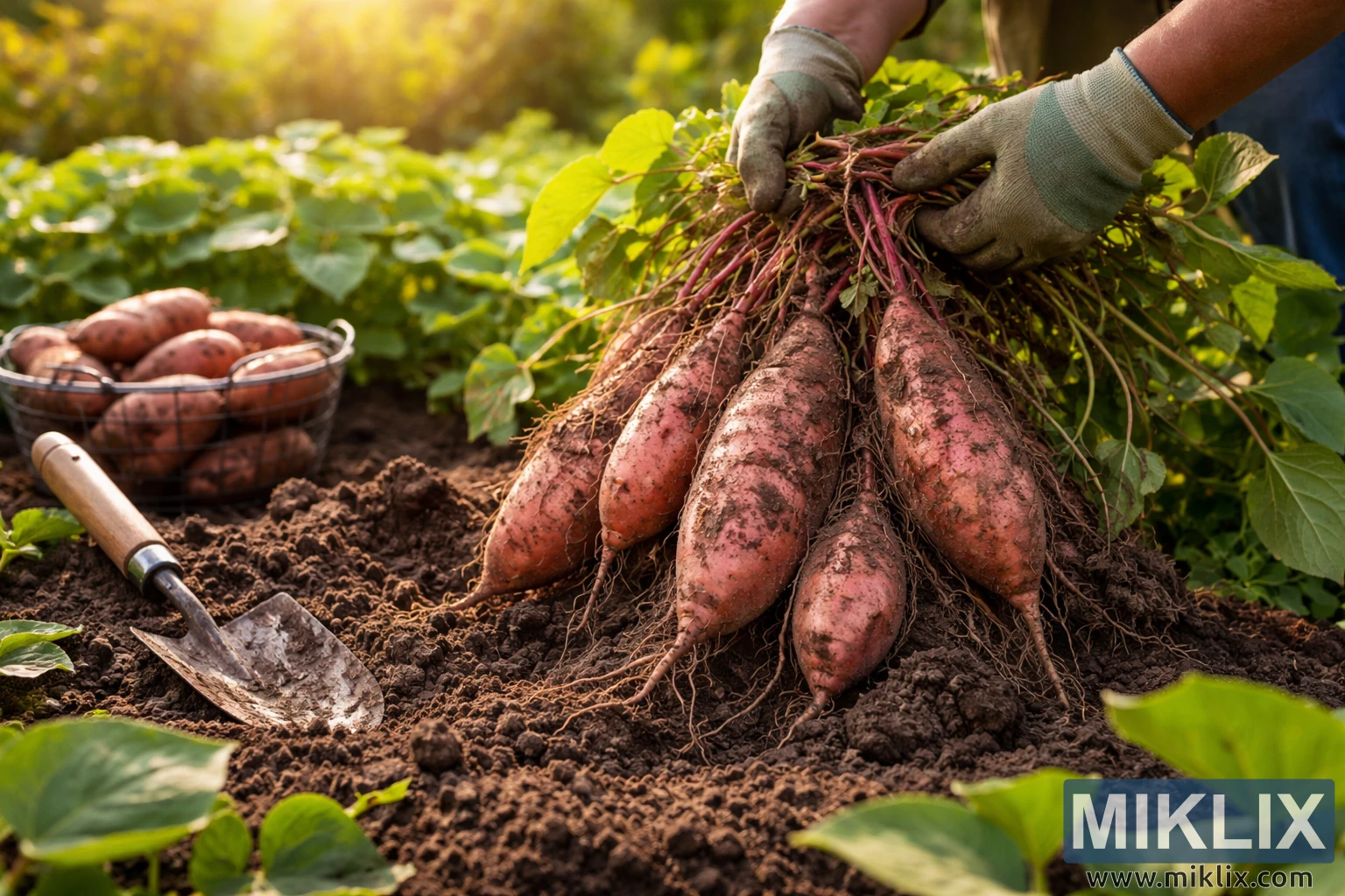Visokoločljivostna pokrajinska fotografija ročnega obiranja sladkega krompirja iz vrtne zemlje, ki prikazuje sveže gomolje, zelene trte, vrtno orodje in toplo naravno svetlobo.
