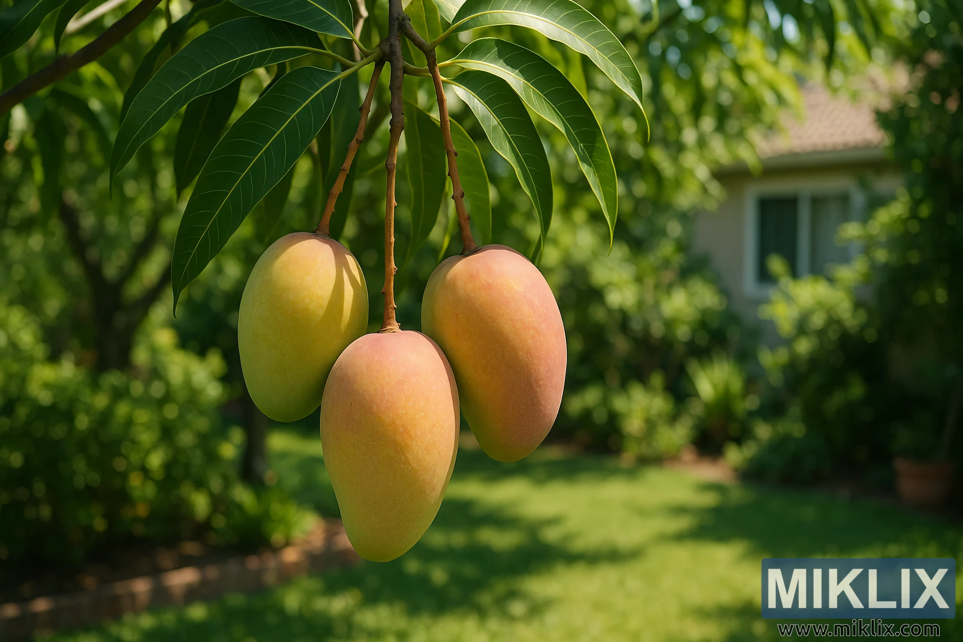 Živahna fotografija zrelih mangov, ki visijo z drevesne veje v mirnem domačem vrtu, obdani z bujnim zelenjem in toplo sončno svetlobo.