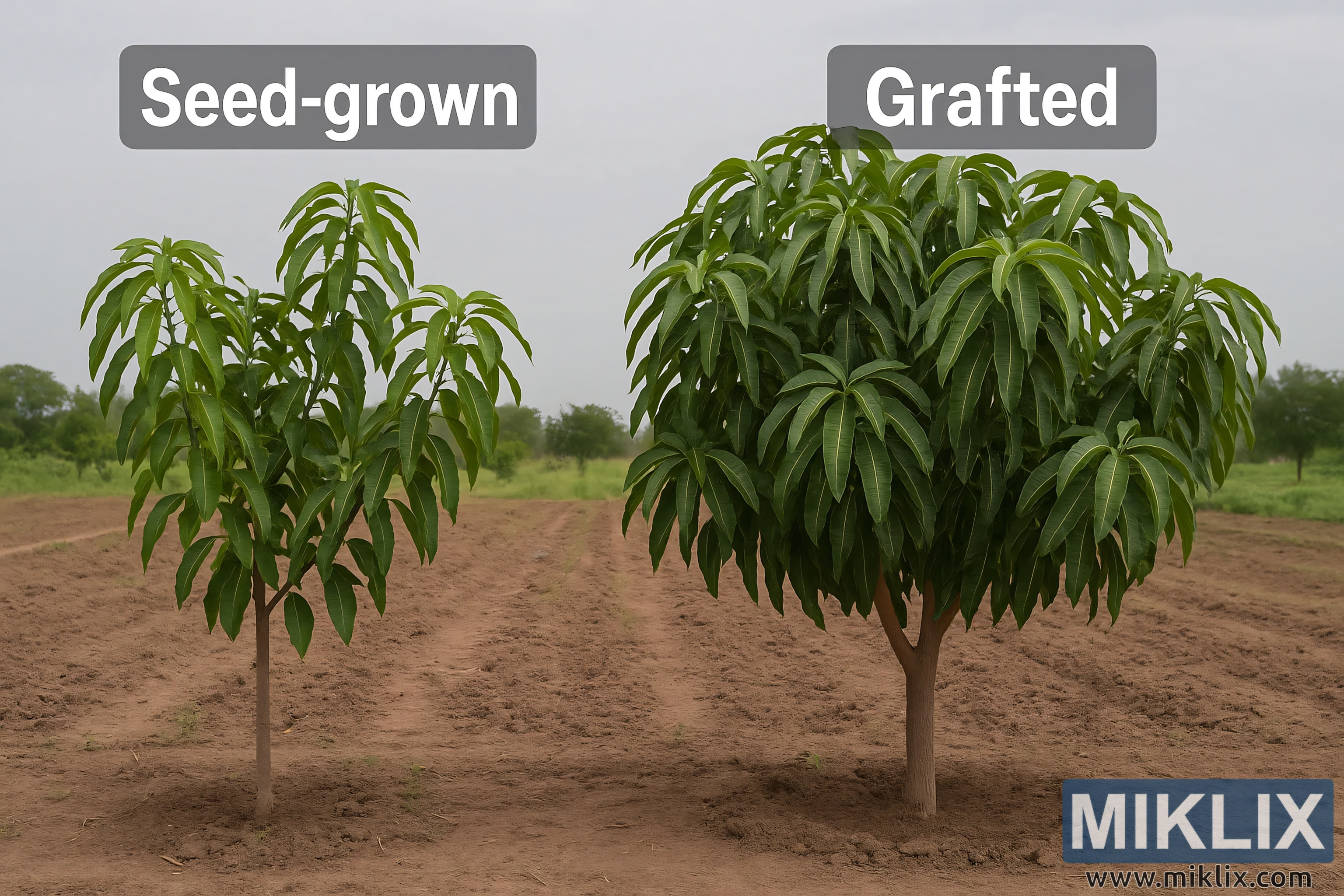 Ta slika primerja mango drevo, vzgojeno iz semen, in cepljeno mango drevo iste starosti, pri čemer poudarja hitrejšo rast in polnejšo krošnjo cepljenega drevesa v dobro pripravljenem kmetijskem okolju.