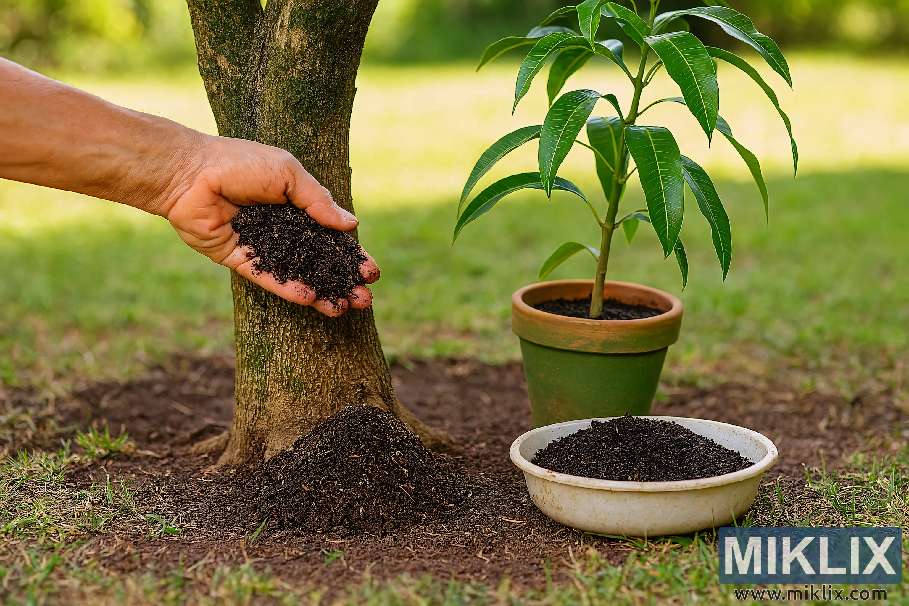 Slika: Organsko gnojenje mangovega drevesa v tropskem sadovnjaku