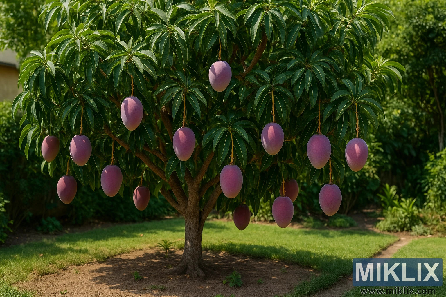Slika prikazuje cvetoče mangovo drevo (Mangifera indica), ki ponosno stoji na urejenem domačem vrtu, obsijano z mehko, zlato sončno svetlobo. Njegova široka krošnja temno zelenih, sijočih listov ustvarja občutek vitalnosti in bujnosti, sončna svetloba pa se filtrira skozi in meče lisaste sence na tla. Trdno, rjavo deblo drevesa podpira številne elegantno ukrivljene veje, obložene z grozdi zrelih mangov. Vsak mango je debel in zaobljen, z bogatim prelivom vijoličnih in rožnatih odtenkov, kar nakazuje na edinstveno, morda hibridno sorto, pripravljeno za obiranje. Njihove gladke, voskaste lupine se na sončni svetlobi rahlo lesketajo in poudarjajo živahen, a hkrati umirjen značaj prizora.