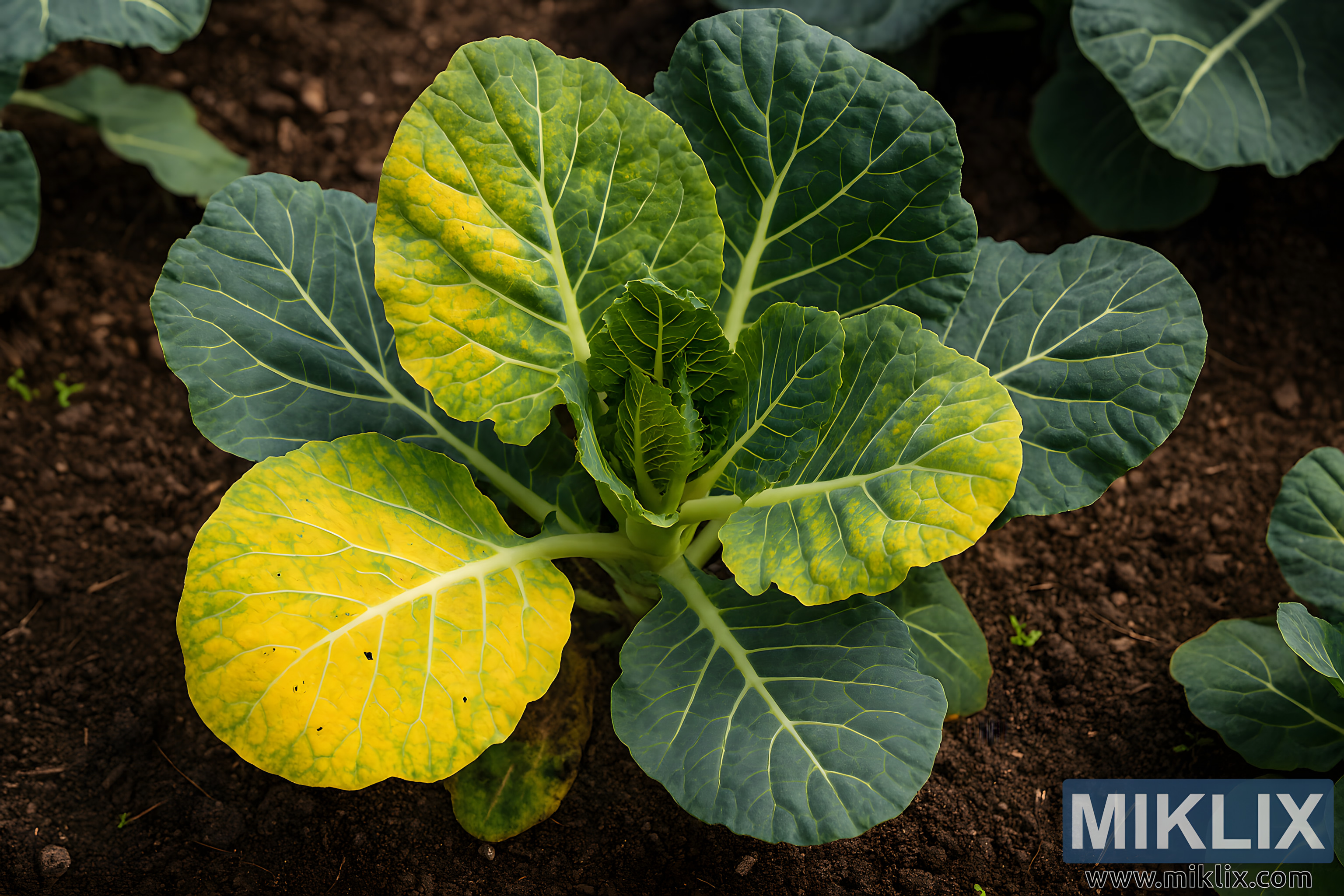 Visokoločljivostna pokrajinska fotografija ohrovta z rumenkastimi listi, ki kažejo na pomanjkanje hranil. Idealna za izobraževalno in kmetijsko uporabo.