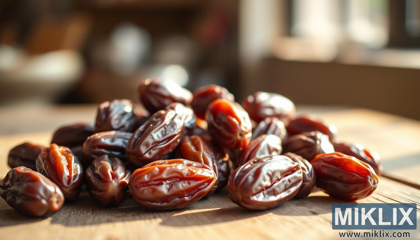 Bližnji posnetek sočnih rjavih datljev na rustikalni leseni mizi, obsijanih z zlato svetlobo z mehkim bokeh ozadjem, ki poudarja teksturo in kakovost.