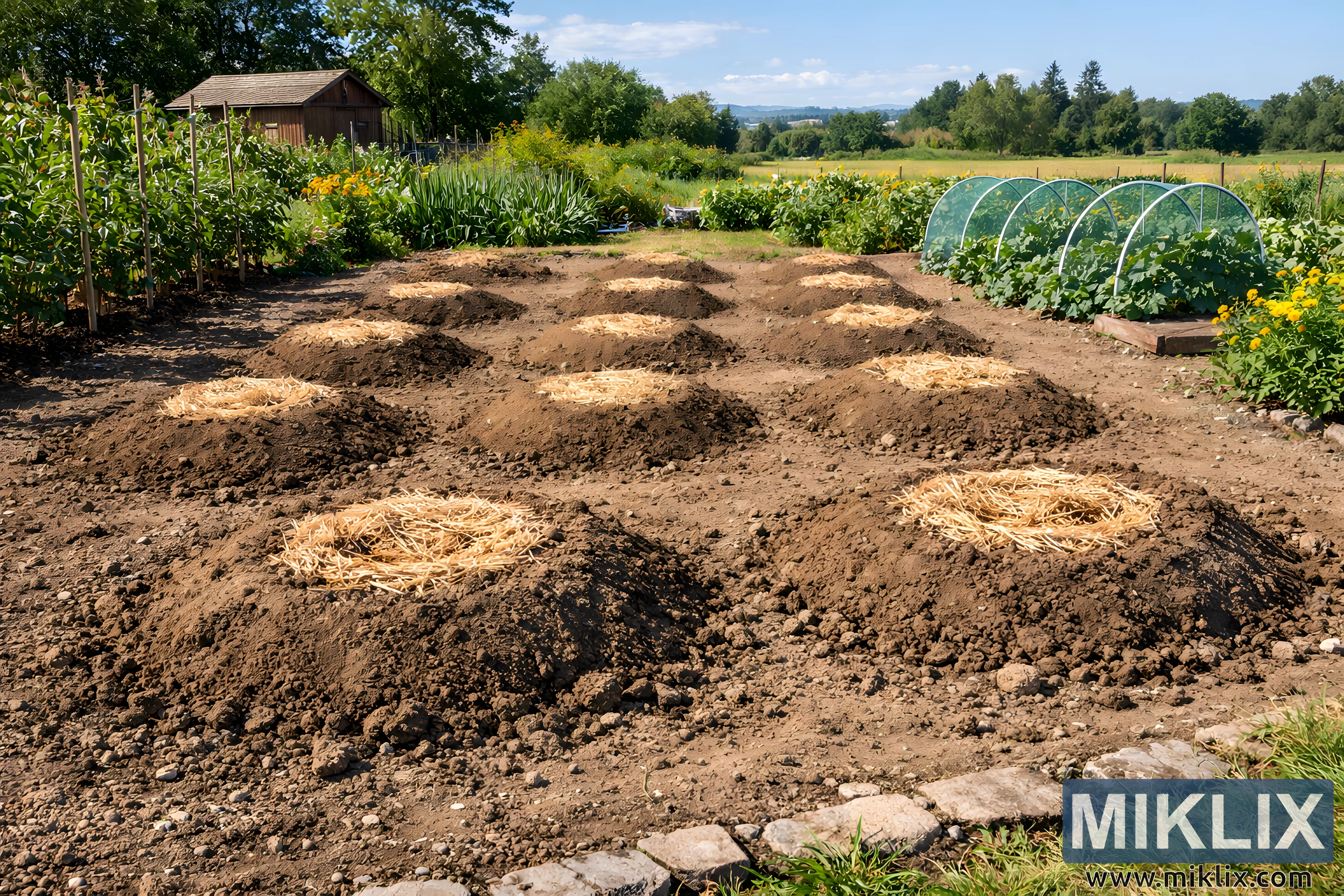 Imazhi tregon një parcelë kopshti me diell dhe të organizuar mirë, të përgatitur posaçërisht për rritjen e pjeprit. Në plan të parë dhe që shtrihet përgjatë pjesës më të madhe të kornizës, janë grumbuj dheu të rrumbullakosur, të shpërndarë në mënyrë të barabartë, të rregulluar në rreshta të rregullta. Çdo grumbull është i përbërë nga tokë e errët, e thërrmueshme dhe që kullon mirë dhe e mbuluar me një fole të vogël me mbulesë kashte të zbehtë të artë, duke sugjeruar përgatitje të kujdesshme për të ruajtur lagështinë, duke parandaluar kalbjen rreth bimëve të ardhshme të pjeprit. Toka midis grumbujve duket e thatë, por e shëndetshme, pak e ngjeshur dhe pa barëra të këqija, duke treguar punime dhe mirëmbajtje të kohëve të fundit.