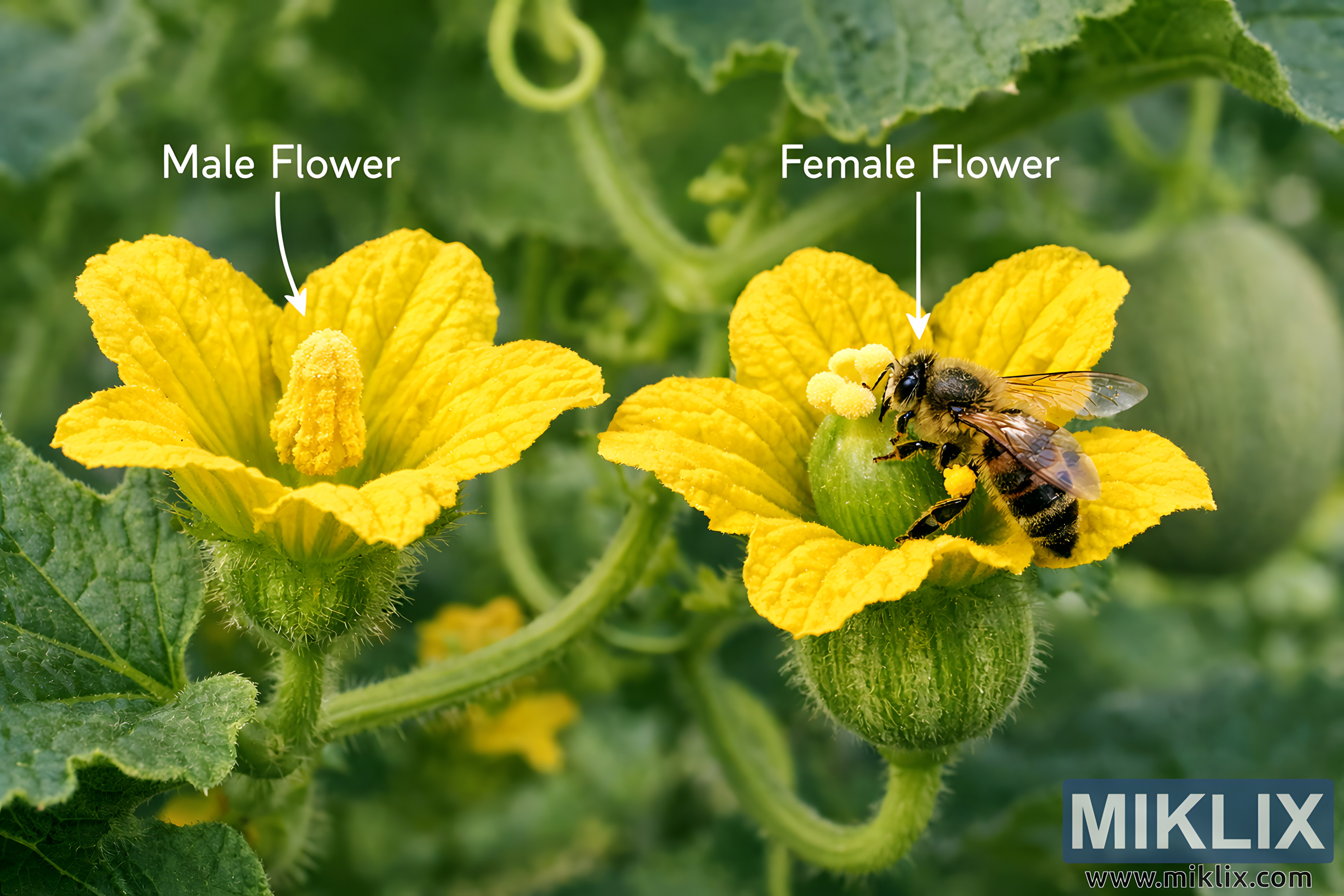 Bee Pollinating Female Cantaloupe Flower Beside Male Blossom
