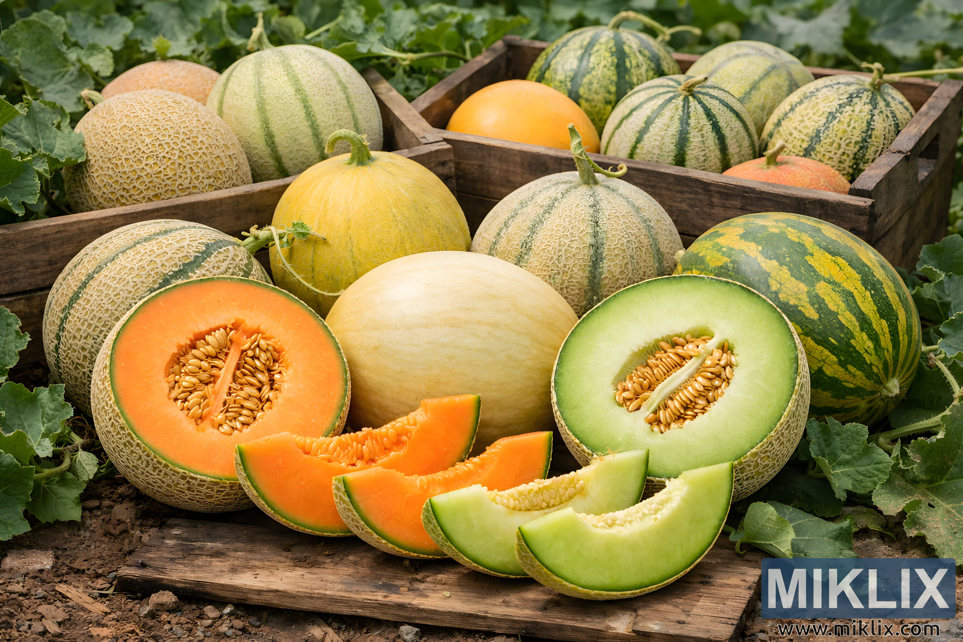 Fotografi me rezolucion të lartë të pjeprit të sapokorrur në një fushë, që tregon pjepër të plotë, të prerë përgjysmë dhe të prerë në feta të varieteteve të ndryshme me shenja të dukshme pjekurie.