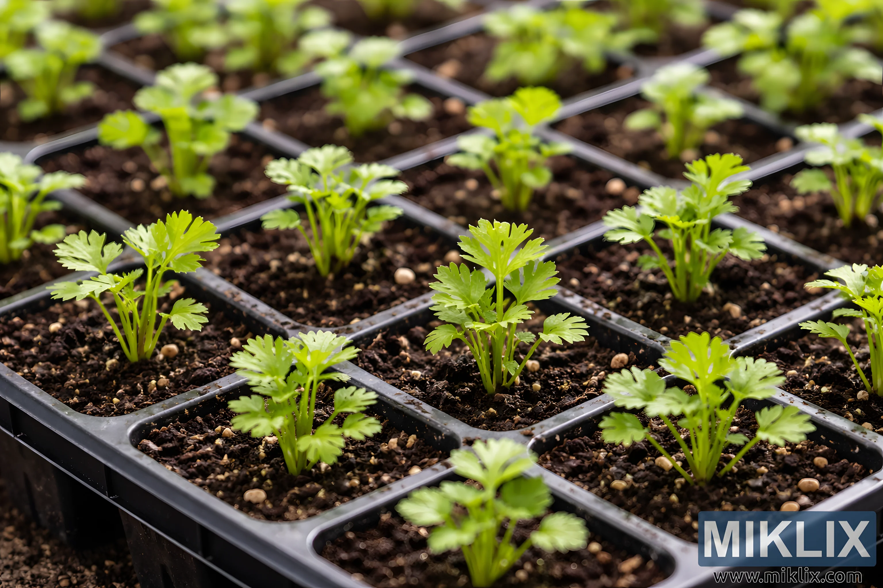 Foto peizazhi me rezolucion të lartë të fidanëve të rinj të selinosë në tabaka me farëra, që tregon fazat e hershme të rritjes me gjethe jeshile të gjalla dhe tokë të lagësht për vazo.