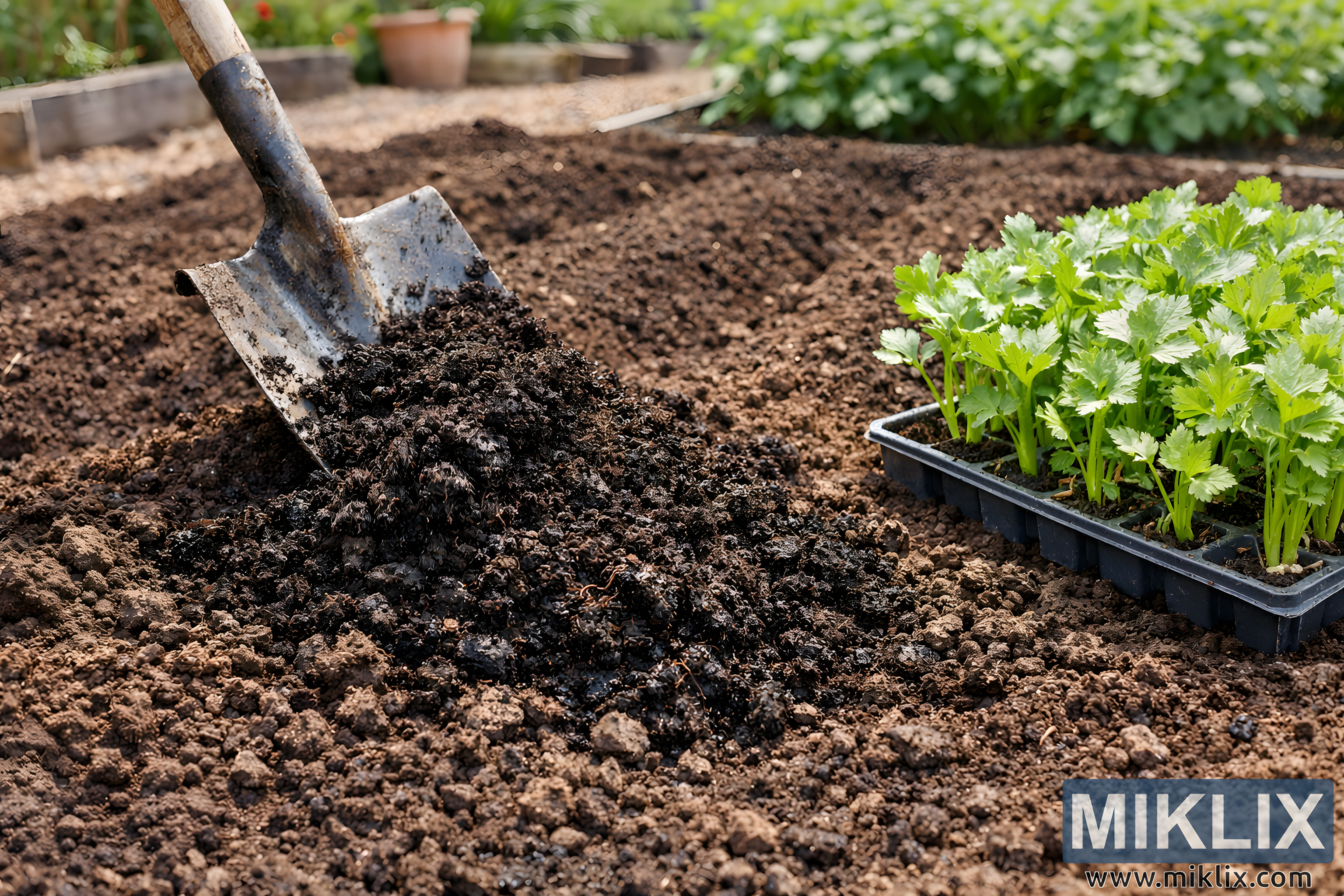 Imazh me rezolucion të lartë i një kopshti të përgatitur për mbjelljen e selinosë, që tregon plehun organik të përzier në tokë të pasur me një lopatë dhe fidanë të shëndetshëm selinoje gati për transplantim.