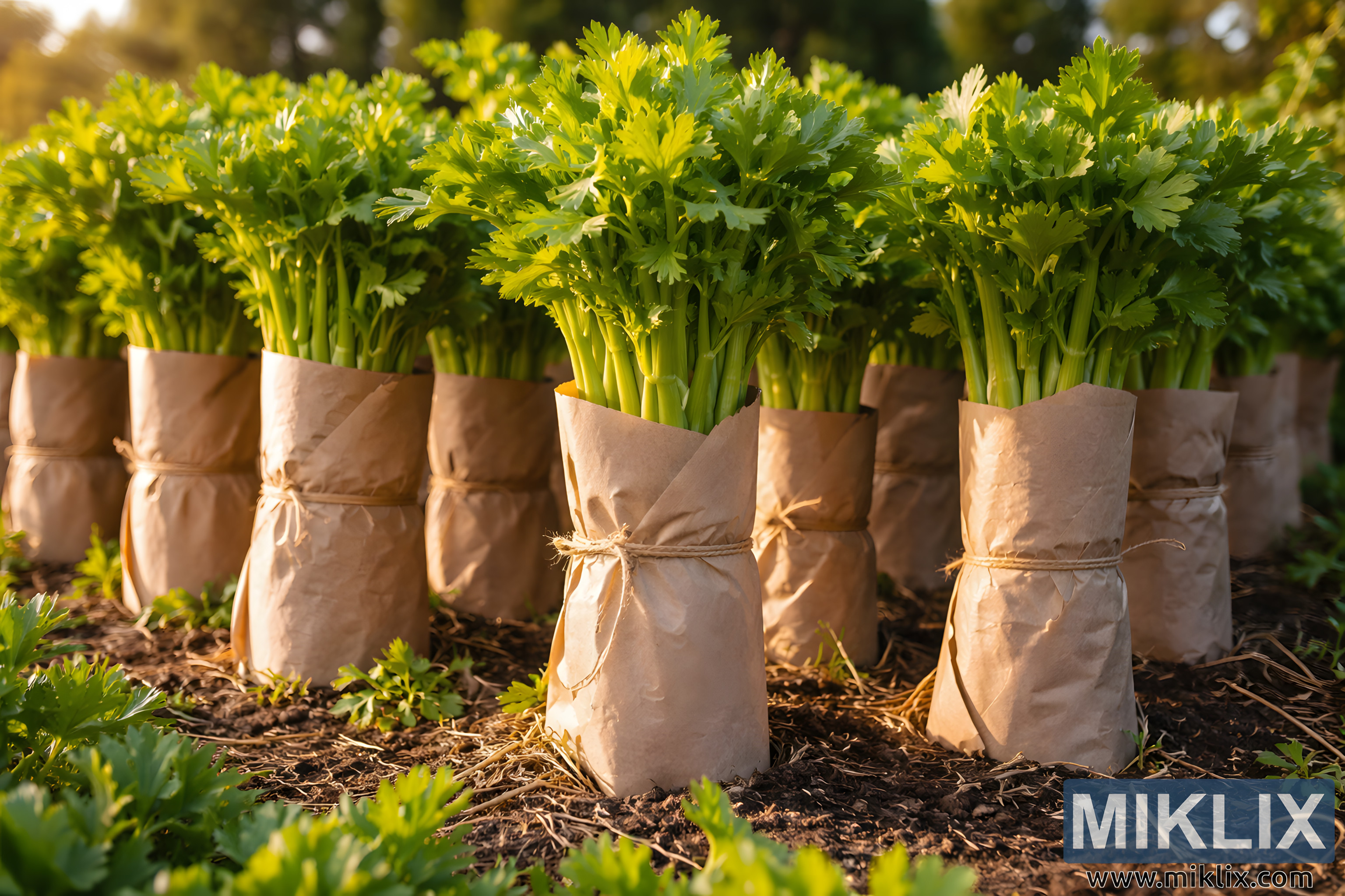 Imazhi paraqet një fotografi peizazhi me rezolucion të lartë të kompozuar me kujdes të bimëve të selinosë që rriten në rreshta të rregullta brenda një kopshti të kultivuar. Çdo bimë selino është në një fazë të avancuar të rritjes, me tufa të dendura kërcejsh të drejtë, të brinjëzuar që mbështesin gjethe të harlisura dhe të dhëmbëzuara në majë. Pjesët e poshtme të kërcejve janë të mbështjella individualisht në mëngë cilindrike prej letre kraft ngjyrë kafe, një teknikë tradicionale zbardhjeje e përdorur për të bllokuar dritën dhe për të inkurajuar kërcej të zbehtë dhe të butë. Mbështjellësit e letrës janë të siguruar me spango natyrale të lidhur rreth pjesës së mesme, duke shtuar një estetikë bujqësore të punuar me dorë.