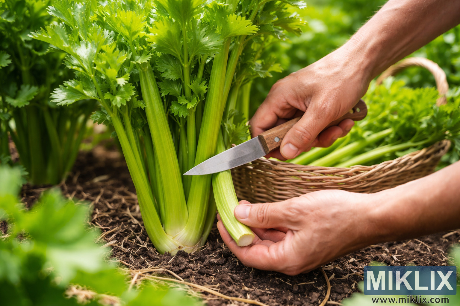 Imazhi tregon një pamje të detajuar dhe nga afër të një bime selino që po korret në një kopsht perimesh të lulëzuar. Në qendër të kornizës, një bimë selino e shëndetshme rritet drejt nga një tokë e errët dhe e kultivuar mirë. Bima është e dendur dhe e gjallë, me kërcej të shumtë të trashë, të gjelbër të zbehtë të grumbulluar fort në bazë dhe të mbuluar me gjethe të freskëta me pala që shtrihen nga jashtë. Rrezet e diellit depërtojnë në të gjithë skenën, duke nxjerrë në pah shkëlqimin dhe lagështinë natyrale të kërcejve të selinosë dhe duke theksuar strukturën e tyre të freskët. Dy duar njerëzore hyjnë në kornizë nga ana e djathtë, duke demonstruar qartë teknikën e korrjes. Njëra dorë tërheq butësisht një kërcell të jashtëm të selinosë pak larg bimës kryesore, duke e përkulur atë nga jashtë për të ekspozuar bazën e saj pa shqetësuar kërcejtë e brendshëm. Dora tjetër mban një thikë të vogël dhe të mprehtë me një dorezë druri, të pozicionuar me kujdes në bazën e kërcellit të zgjedhur. Tehu është i vendosur në kënd pikërisht aty ku kërcelli takohet me tokën, duke treguar një prerje të qëllimshme të projektuar për të hequr vetëm kërcellin e jashtëm të pjekur, duke lënë bërthamën e bimës të paprekur në mënyrë që të mund të vazhdojë të rritet. Toka rreth bazës së selinosë duket e lirshme dhe e pasur, me copa të dukshme të lëndës organike, duke sugjeruar një kopsht të mirëmbajtur. Në sfond, bimë të tjera selino rriten në rreshta të rregullta, të turbullta butësisht për të krijuar thellësi dhe për të tërhequr vëmendjen ndaj veprimit kryesor në plan të parë. Një shportë e endur e mbushur me kërcej selino të sapokorrur ndodhet menjëherë pas duarve, pjesërisht e dukshme dhe duke përforcuar ndjesinë e një korrjeje aktive. Kompozimi i përgjithshëm përcjell një moment të qetë dhe praktik të kopshtarisë praktike, duke theksuar praktikat e qëndrueshme të korrjes, kujdesin për bimën dhe freskinë e produkteve të rritura në shtëpi. Orientimi i peizazhit i lejon shikuesit të shohë si detajet e imëta të veprimit të korrjes ashtu edhe mjedisin përreth kopshtit, duke krijuar një narrativë vizuale realiste dhe udhëzuese.