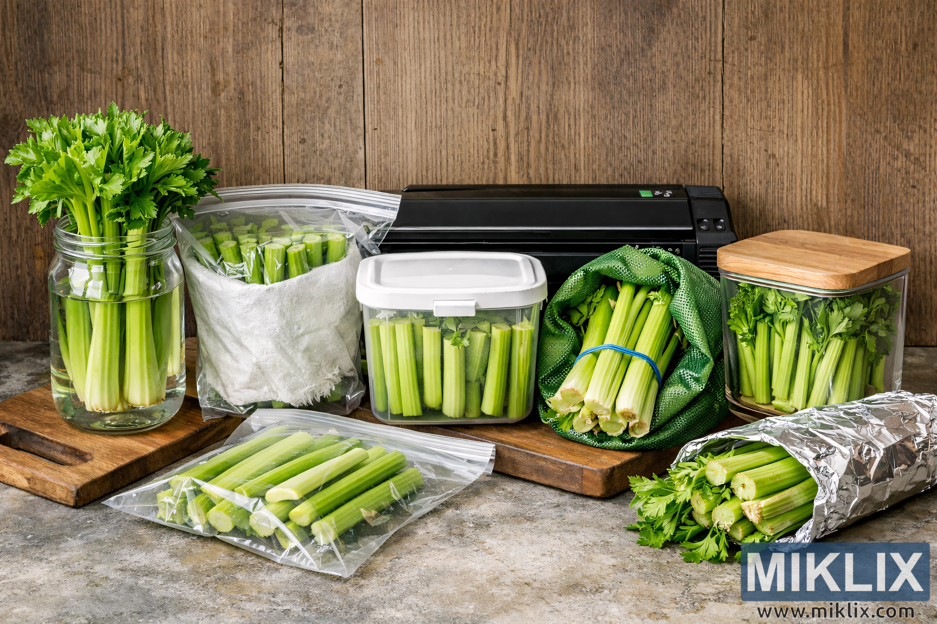 Imazh me rezolucion të lartë që ilustron metoda të ndryshme për ruajtjen e selinos së korrur për ta mbajtur të freskët, duke përfshirë kavanoza uji, enë hermetike, mbyllje me vakum, qese prodhimesh dhe mbështjellje me fletë metalike.