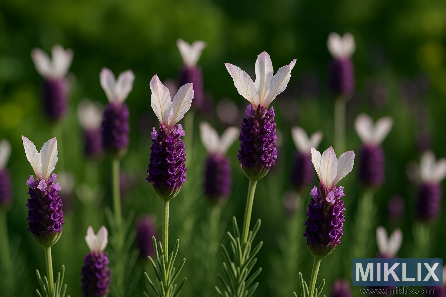 Kjo fotografi e detajuar bukur nga afër tregon Lavandula stoechas 'Ballerina', një nga varietetet më elegante dhe vizualisht dalluese të livandos spanjolle. E kapur në lulëzim të plotë në një ditë vere me diell, imazhi nxjerr në pah tiparet karakteristike të luleve të bimës - gjemba lulesh të pasura, vjollcë të thellë, të kurorëzuara me gjethe lulesh që ndryshojnë ngjyrë nga e bardha në rozë të butë dhe vjollcë të zbehtë livandoje. E zhytur në dritë natyrale, përbërja rrezaton një ndjesi freskie dhe qetësie, duke ofruar një pamje të përsosur të sharmit të kopshtit mesdhetar.