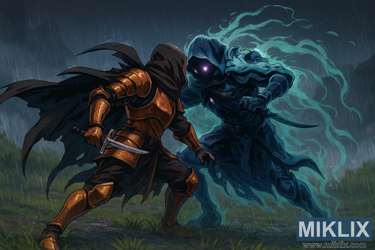 Mjedisi përforcon intensitetin e duelit. Shiu i rrëmbyeshëm bie diagonalisht nëpër skenë, duke shpërndarë ajrin dhe duke errësuar tokën me baltë nën këmbët e tyre. Pellgje të cekëta dhe bari i lagësht pasqyrojnë dritë të zbehtë, ndërsa spërkatjet dhe toka e trazuar nënkuptojnë lëvizje të shpejtë pak para këtij çasti të kapur. Sfondi zbehet në një turbullirë stuhie qielli gri-blu dhe terreni të paqartë, duke e mbajtur fokusin e shikuesit të përqendruar te luftëtarët. Ndriçimi është i zymtë dhe kinematografik, me blu të ftohtë dhe ngjyrë vjollce që dominojnë skenën, në kontrast me nuancat më të ngrohta bronzi-ari të armaturës së të Njomururve dhe shkëlqimin e çuditshëm vjollcë që buron nga Alecto. Në përgjithësi, imazhi përcjell një ndjenjë dëshpërimi, aftësie dhe konflikti mitik, duke portretizuar një moment kyç në një valle vdekjeprurëse midis vendosmërisë së vdekshme dhe vrasjes fantazmatike.