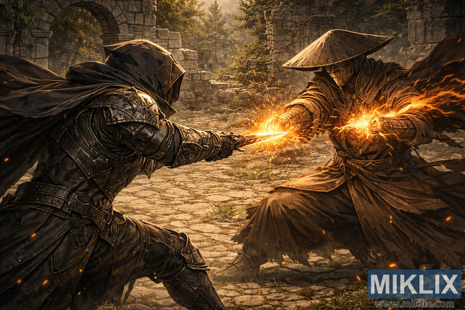 Oborri i rrënuar e kornizon përplasjen me detaje të paqarta. Harkat e thyera prej guri ngrihen pas tyre, skajet e të cilave zbuten nga myshku dhe hardhitë zvarritëse, ndërsa pllakat e çara të gurëve nën këmbët e tyre formojnë një mozaik të ashpër gri dhe kafe. Në sfond, pemët me gjelbërim të përjetshëm dhe malet e zbehta lahen në dritën e artë të muzgut, por ato mbeten dytësore ndaj konvergjencës së dhunshme në qendër.