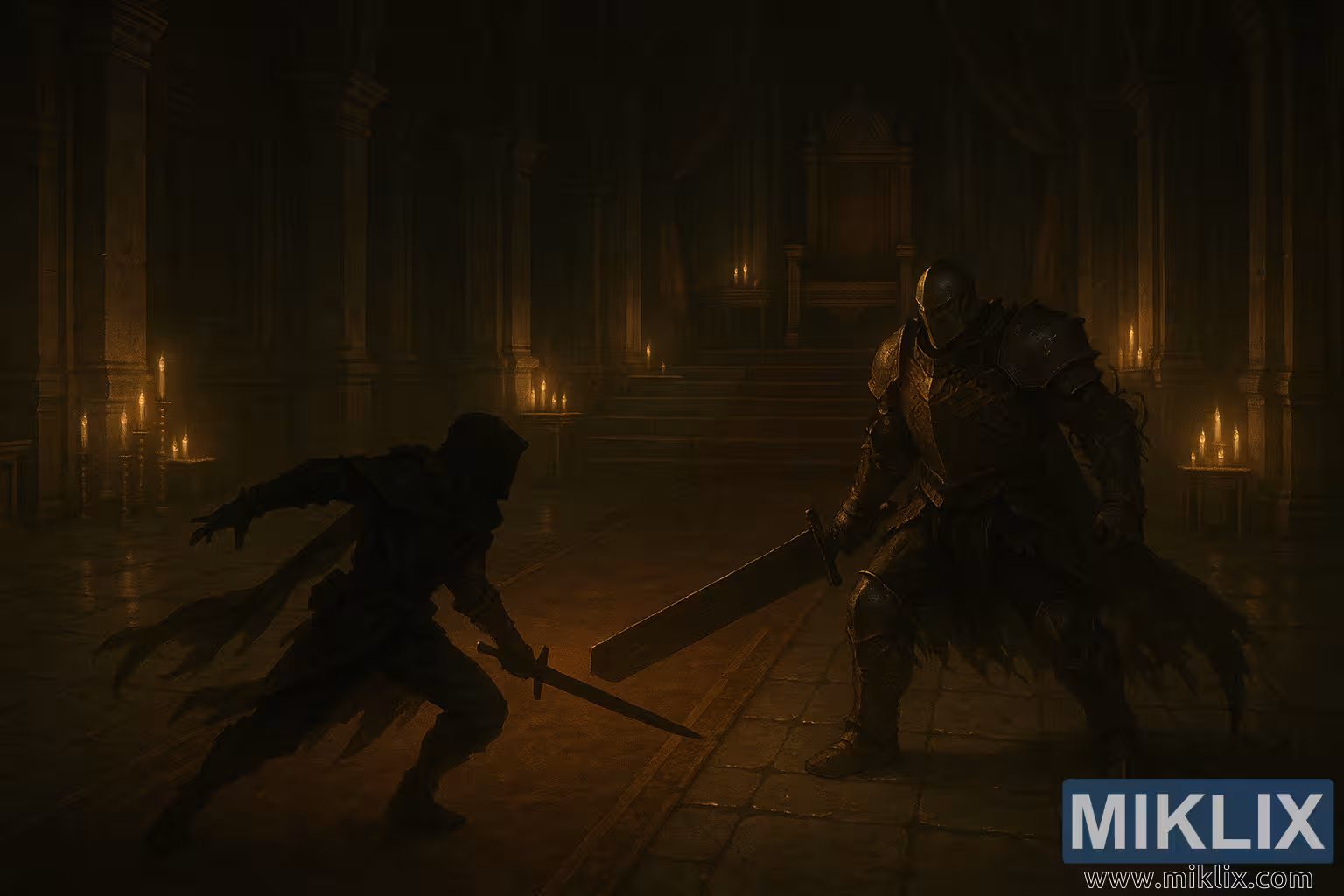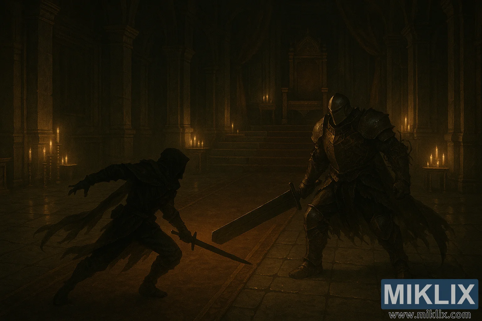 Imazhi përshkruan një përballje të tensionuar dhe realiste të fantazisë së errët, të vendosur brenda një dhome të madhe froni, e parë nga një perspektivë pak e ngritur dhe izometrike. Hapësira është e gjerë dhe solemne, e përcaktuar nga kolona guri gjigante që tërhiqen në hije dhe kornizojnë korridorin qendror të dhomës. Ndryshe nga një burg i nëndheshëm, dhoma mbart një ndjesi mbretërie të dikurshme: dyshemetë prej guri janë të shtruara me kujdes, reflektuese në mënyrë delikate, dhe një qilim i kuq i thellë shtrihet në qendër drejt një podiumi të ngritur. Në fundin tjetër, një fron i zbukuruar qëndron në një autoritet të qetë, pjesërisht i errësirës, por ende qartë i dukshëm, shpina e tij e gdhendur dhe mbështetëset e krahëve kapin pikat e zbehta nga qirinjtë aty pranë.