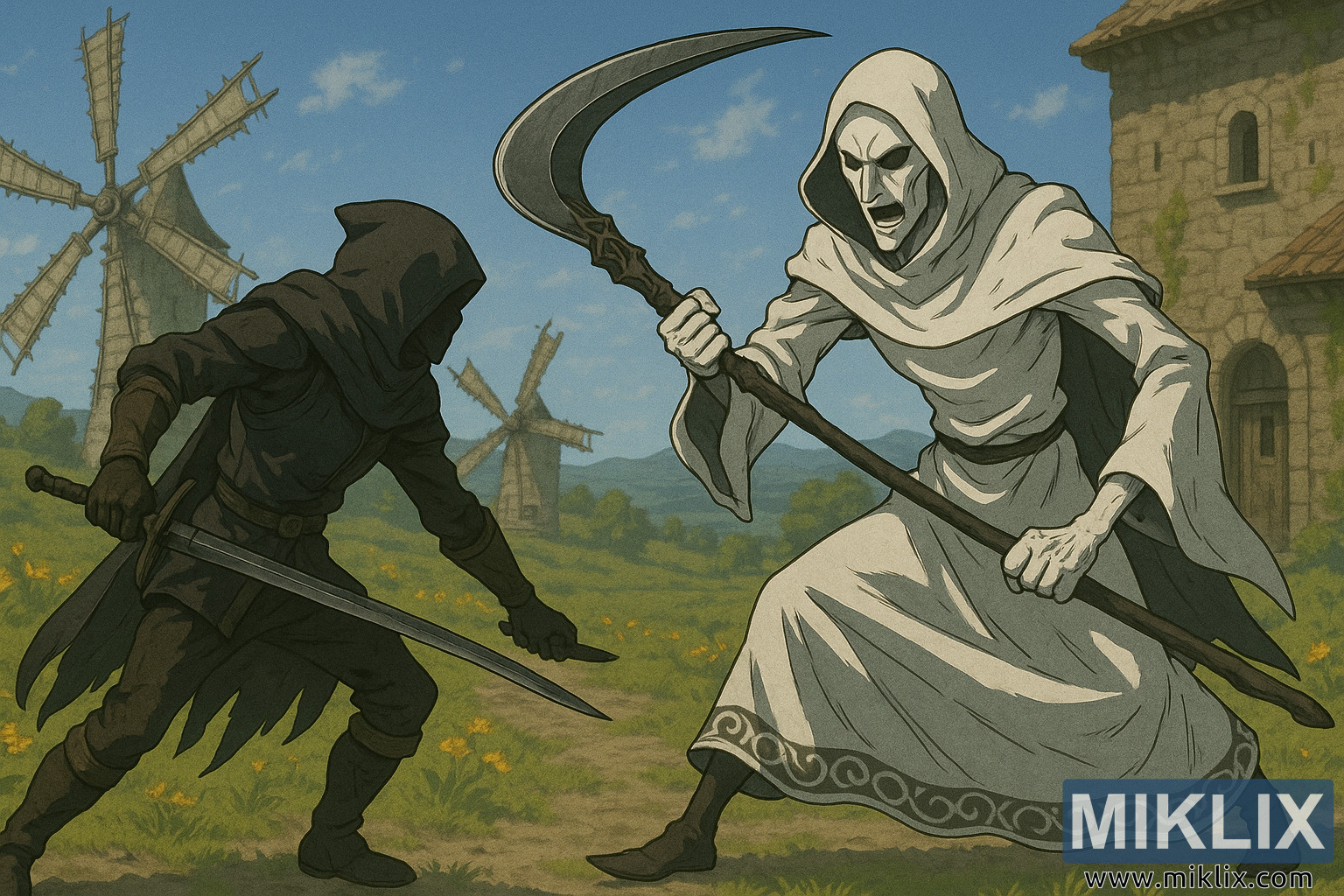 Imazhi paraqet një ilustrim arti fansash në stilin anime të vendosur në fushat e ndriçuara nga dielli të Dominula, Fshati i Mullirit të Erës nga Elden Ring, i realizuar në një kompozim të gjerë peizazhi kinematografik. Në plan të parë, dy figura janë të ngrira në një moment përplasjeje të afërt, siluetat e tyre të kundërta përcaktojnë tensionin e skenës. Në të majtë qëndron i Njomuri, i veshur me setin e armaturave Black Thikë. Armatura është e errët, mat dhe e shtresuar, me një mantel me kapuç që errëson shumicën e tipareve të fytyrës, duke theksuar anonimatin dhe vdekshmërinë. Qëndrimi i të Njomururit është i ulët dhe agresiv, me gjunjë të përkulur dhe bust të pjerrët përpara, duke sugjeruar lëvizje të shpejtë dhe saktësi si të një vrasësi. Në dorën e tyre të djathtë, ata kapin një teh të shkurtër, tehu i të cilit kap pika të zbehta, ndërsa krahu i majtë është i shtrirë pak për ekuilibër. Skajet e grisura të mantelit dhe copat e lëkurës së shtresuar zvarriten lehtë nga pas, duke nënkuptuar lëvizje dhe gatishmëri për të goditur.