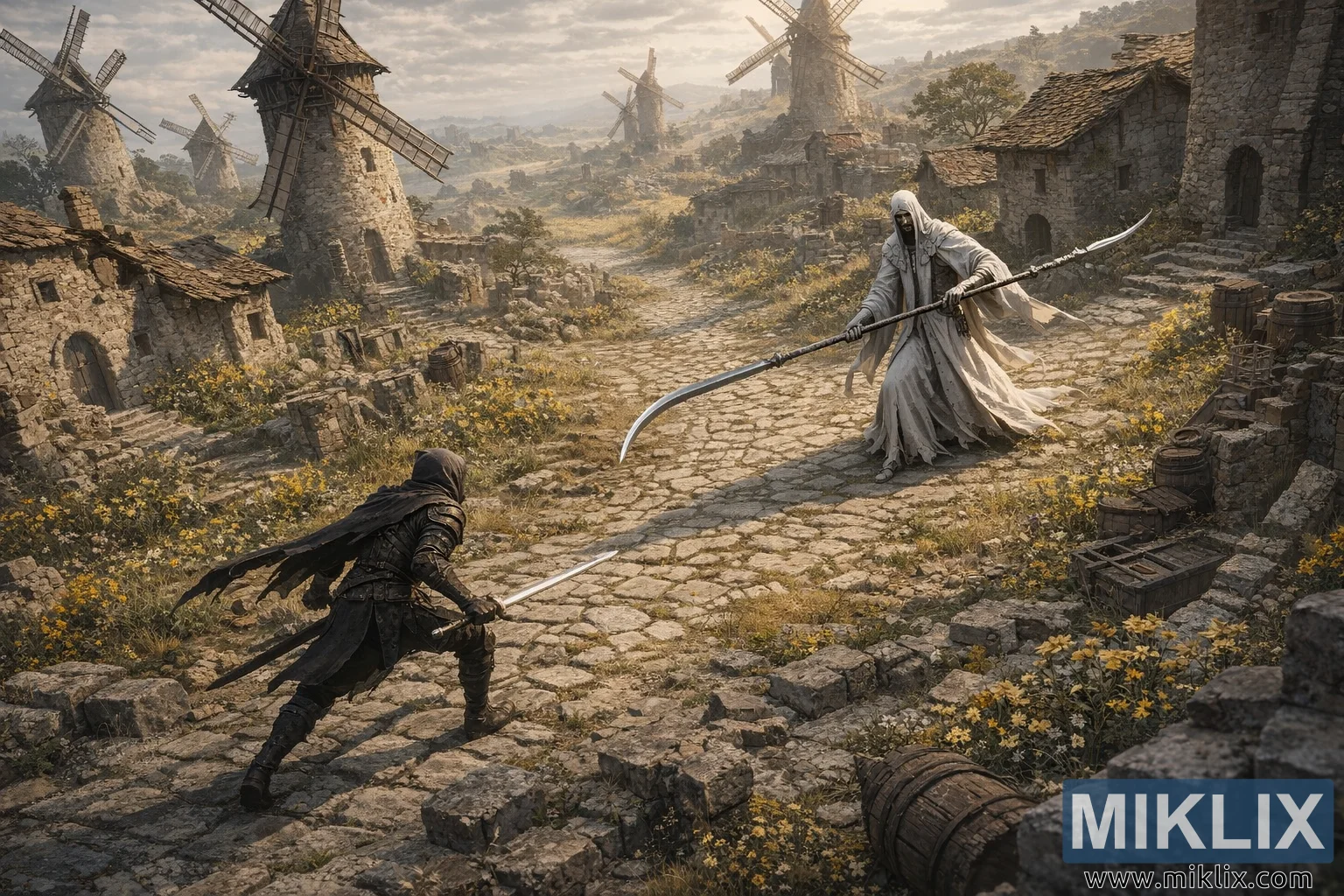 Imazhi paraqet një pamje të gjerë, në stilin izometrik, të një përballjeje të tensionuar të vendosur në Dominula, Fshati i Mullinjve me Erë nga Elden Ring. Kamera tërhiqet prapa dhe rrotullohet në një kënd diagonal të ngritur, duke i lejuar shikuesit të shohë njëkohësisht si duelin ashtu edhe mjedisin përreth. Një rrugë dredha-dredha me kalldrëm kalon nëpër qendër të fshatit, gurët e saj të pabarabartë të rikuperuar pjesërisht nga bari dhe tufat e luleve të egra të verdha. Shtëpi guri të gërryera me çati të thyera dhe mure të çara shtrihen përgjatë rrugës, ndërsa mullinj ere të lartë e të dukshëm ngrihen në sfond, tehet e tyre prej druri të ngrira në mes të kthesës kundër një qielli gri me re. Fshati ndihet i braktisur dhe çuditërisht i qetë, duke rritur ndjesinë e dhunës së afërt.