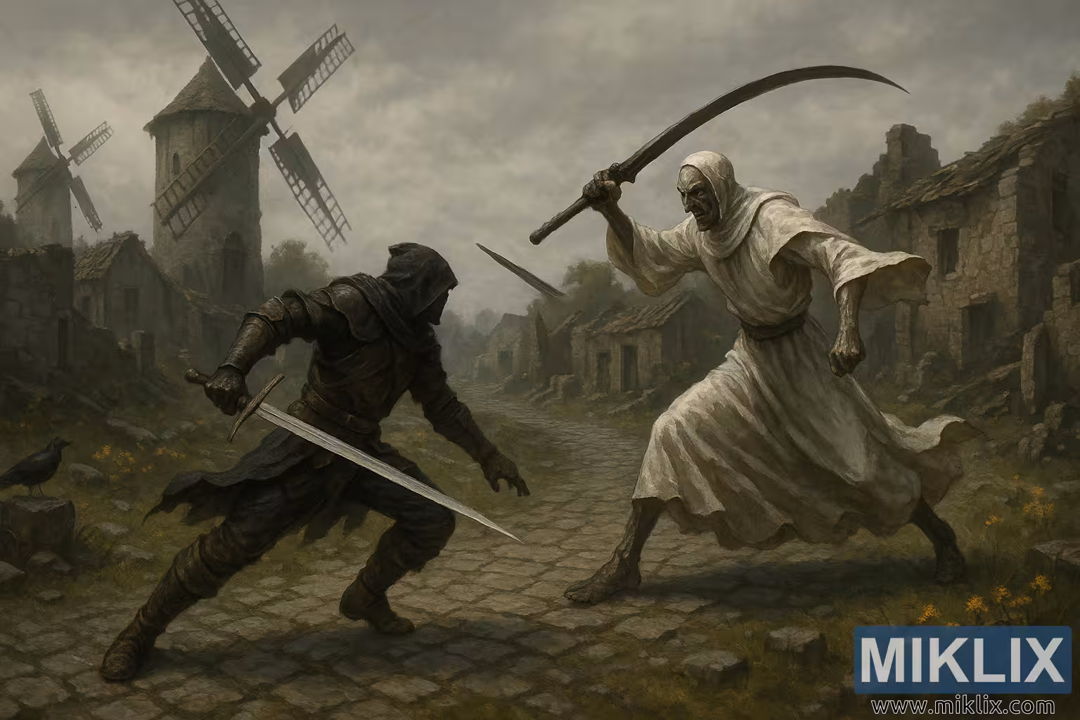 Detajet e vogla mjedisore e thellojnë atmosferën: një sorrë e zezë shikon nga një gur i thyer pranë planit të parë, dhe mullinjtë e erës në distancë ngrihen si roje të heshtura. Kompozimi i përgjithshëm kap luftime të vërteta në lëvizje në vend të një përballjeje të pozuar, me të dyja figurat të pabalancuara në mënyra realiste dhe plotësisht të përkushtuara ndaj sulmeve të tyre. Imazhi përcjell brutalitetin, tensionin dhe bukurinë rrëqethëse të betejës në Tokat Ndërmjet, të përshtatura nga qetësia shqetësuese e Fshatit të Mullinjve të Erës Dominula.