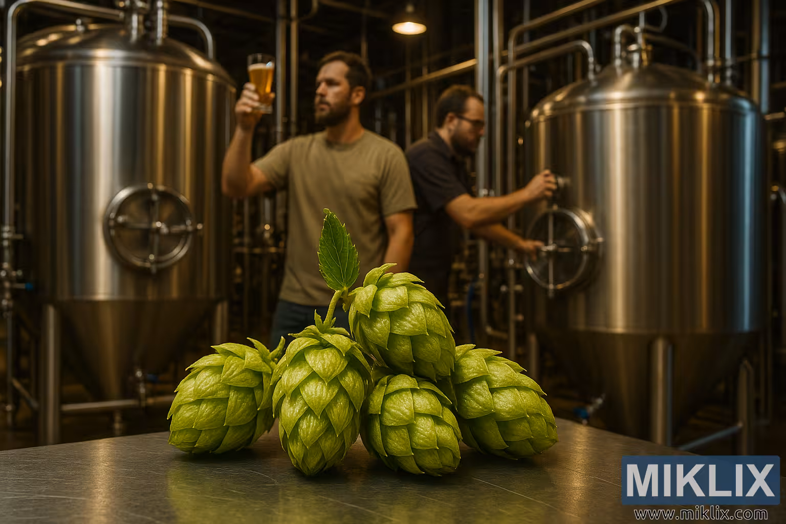 Sfondi zgjeron fushëveprimin e skenës, me rreshta rezervuarësh çeliku inox të shndritshëm që ngrihen në një rrjet tubash dhe aksesorësh të lëmuar. Sipërfaqet e lakuara të rezervuarëve pasqyrojnë ndriçimin e ngrohtë dhe të artë, duke zbutur mprehtësinë industriale të mjedisit me një shkëlqim pothuajse tërheqës. Ndërveprimi i dritës dhe hijes thekson shkallën e hapësirës, duke përcjellë madhësinë dhe fuqinë e prodhimit të birrës komerciale, ndërkohë që ruan një ndjenjë intimiteti në plan të parë ku shtrihet humulusi. Kompozimi me kënd të gjerë e rrit këtë dualitet, duke e tërhequr syrin e shikuesit nga jashtë, përmes birrarisë së madhe, por duke e sjellë vazhdimisht atë përsëri te thjeshtësia e humulusit, e cila e ankoron imazhin me bukuri organike.