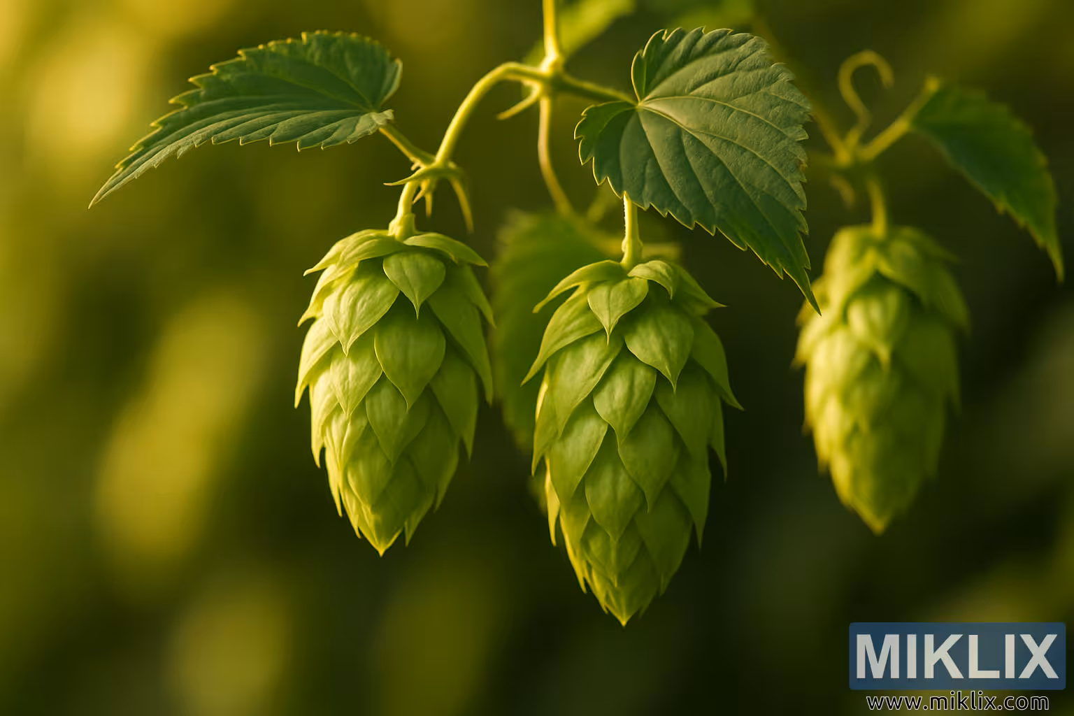 Ky imazh paraqet një pamje të gjallë dhe intime të koneve të gjelbra të ndezura të humulusit të varura me delikatesë nga kërcejtë e tyre të hollë, secila kone e paraqitur me qartësi të jashtëzakonshme dhe teksturë të gjallë. Drita, e ngrohtë dhe e artë, derdhet nga një diell i nënkuptuar i pasdites së vonë, duke ndriçuar degëzat e shtresuara të koneve dhe duke u dhënë atyre një shkëlqim të butë e natyror. Çdo degëz në formë luspash kap dritën ndryshe, duke krijuar variacione delikate në nuancë - nga skajet e zbehta të verdha-jeshile deri te jeshilat më të thella dhe më të ngopura të fshehura brenda palosjeve. Këto ndryshime tonale shtojnë thellësi dhe dimensionalitet, duke tërhequr vëmendjen në arkitekturën organike të humulusit.