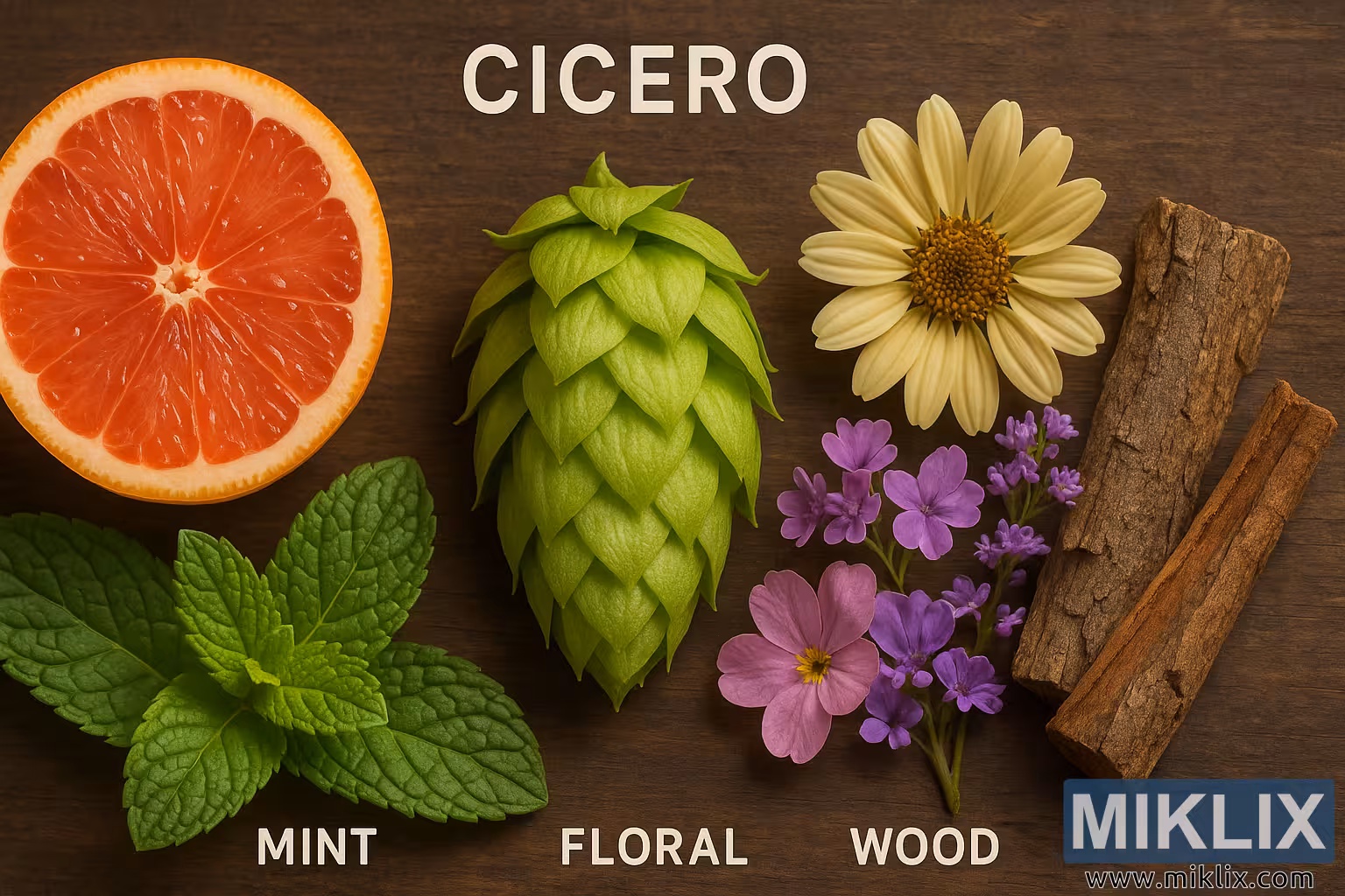 Vizualizim me detaje të larta i aromave karakteristike të humulusit Cicero, duke përfshirë nota agrume, mente, lulesh dhe druri të rregulluara rreth një koni humulusi.