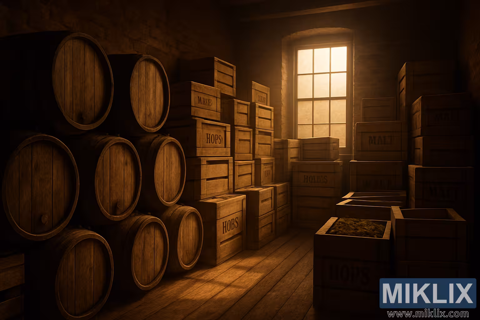 Në të majtë, një kullë me fuçi të rrumbullakosura dhe të konsumuara sugjeron dekada përdorimi, sipërfaqet e tyre të lakuara që zbulojnë modele delikate të kokrrizave të thelluara nga mosha dhe lagështia. Çdo fuçi është e vendosur fort pas tjetrës, duke krijuar një mur druri të pasur me nuanca mjalti. Në të djathtë dhe drejt pjesës së pasme, arka me madhësi të ndryshme janë të grumbulluara me kujdes, disa të shënuara me etiketa të shabllonuara si "MALT", "HOPS" dhe "MISËR". Disa arka qëndrojnë të hapura, duke zbuluar grumbuj të teksturuar me humlu të tharë ose thasë të ashpër prej cope poshtë. Prania e tyre e pasuron në mënyrë delikate atmosferën me aromën e imagjinuar të humlu, maltit dhe kokrrizave të ruajtura.