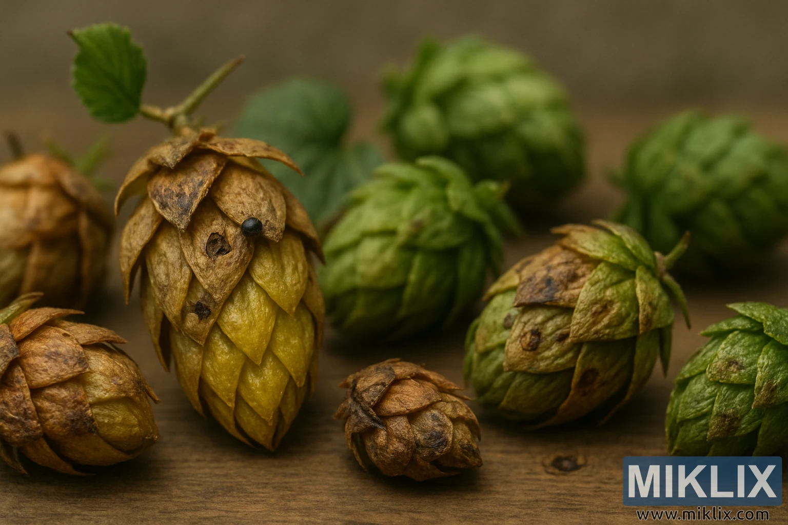 Aty pranë, kone të tjera i bëjnë jehonë këtij rrëfimi të papërsosmërisë, luspat e tyre të gjelbra dikur të gjalla u bënë lëkurore dhe të brishta në skaje. Ndryshimet në ngjyrë janë të pabarabarta - disa kone tregojnë dëmtime të lokalizuara, ndërsa të tjerat duken pothuajse tërësisht të vyshkura, struktura e tyre shembet nga brenda. Kundër tyre qëndrojnë disa bimë më të shëndetshme të humlusit në tokën e mesme, ende të gjelbra dhe relativisht të paprekura, megjithëse edhe këto mbajnë shenja delikate: njolla të errëta të zbehta, grisje të vogla në palosjet e tyre delikate, njolla të vogla që aludojnë në stres ose sëmundje. Ky bashkëvendosje midis të dëmtuarës dhe asaj që mbijeton nënvizon si brishtësinë dhe qëndrueshmërinë e natyrshme në këto bimë, ashtu edhe vijën e hollë si brisk midis një korrjeje që kontribuon në birrë aromatike me cilësi të lartë dhe një që rrezikon prishjen ose shijet e këqija.