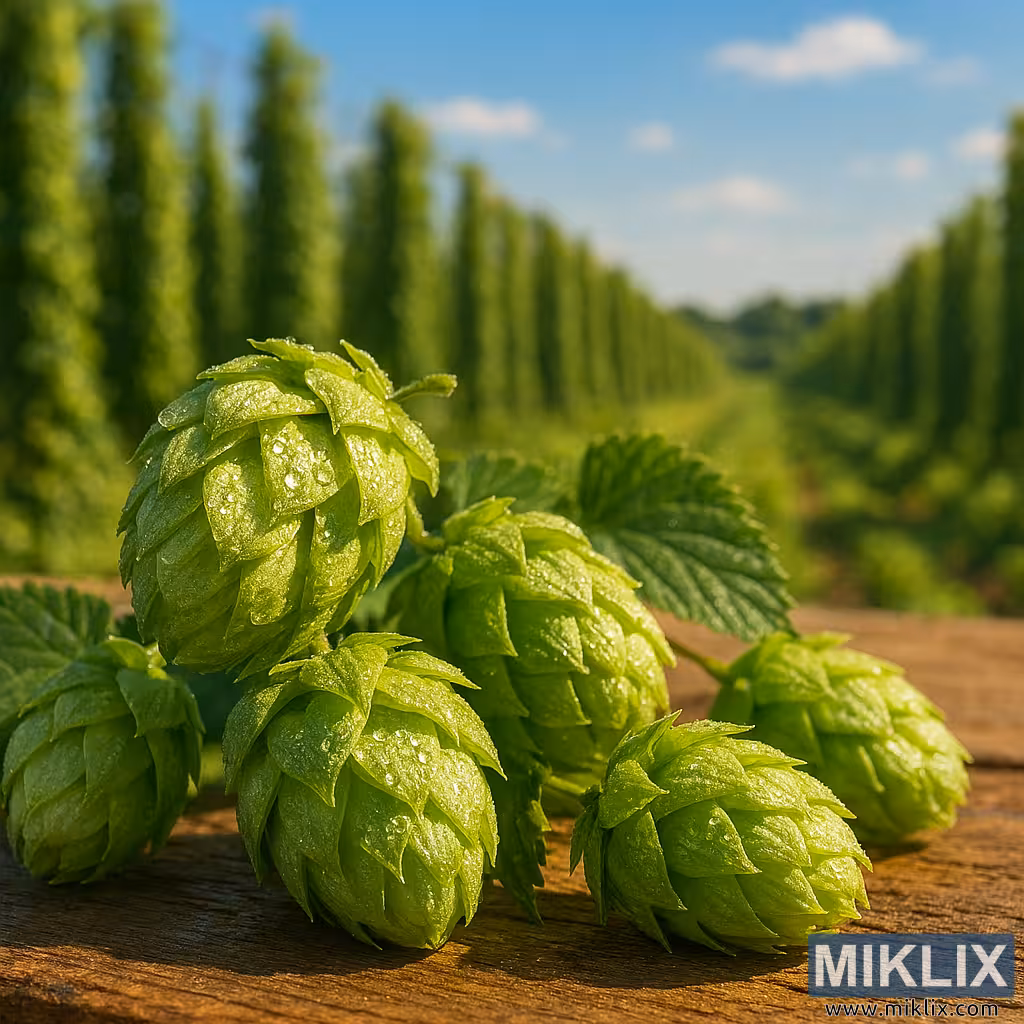Një pamje nga afër me rezolucion të lartë dhe e orientuar drejt peizazhit paraqet kone humuli të sapokorra të vendosura në një tavolinë druri rustike, duke kapur bukurinë prekëse dhe romancën e një kopshti humuli në sezonin e pikut. Në plan të parë, disa bimë humuli në formë koni qëndrojnë në një tufë të kujdesshme, gjethet e tyre të shtresuara si pllaka të vogla dhe të ngjyrosura me një jeshile të çelët të gjallë me një ngrohtësi të zbehtë të verdhë. Boçet duken të plota dhe të shëndetshme, me skaje të pastra dhe tekstura të holla, si letër që kapin dritën. Rruaza vese mëngjesi ngjiten në gjethet e jashtme të boçeve dhe në gjethet aty pranë, duke shkëlqyer si pika të vogla dhe duke sugjeruar ajër të freskët dhe të pastër në fillim të ditës. Një gjethe humuli e gjelbër e thellë me skaje të dhëmbëzuara shtrihet në të djathtë, venat e saj të përcaktuara qartë; gjethet dhe kërcejtë më të vegjël shtojnë parregullsi natyrore, duke përforcuar se këto janë bimë të vërteta, të sapokorra dhe jo një objekt i stilizuar.