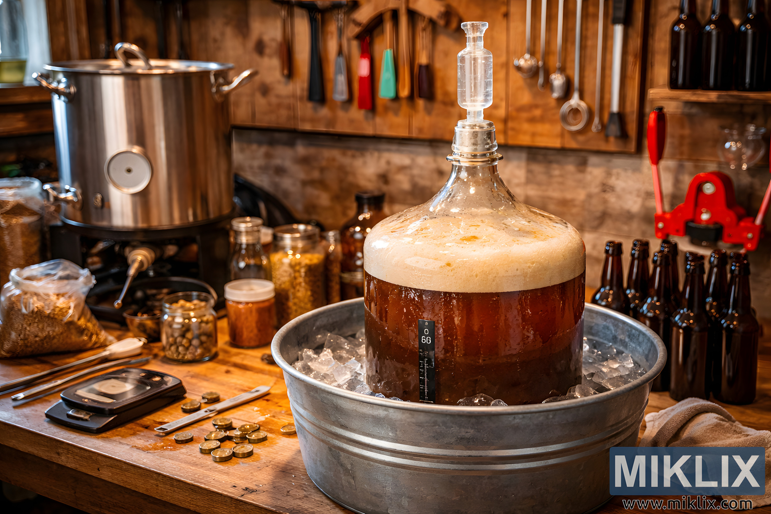 Imazhi përshkruan një mjedis të organizuar me kujdes për prodhimin e birrës në shtëpi, i vendosur në atë që duket të jetë një garazh ose punishte bodrumi komode, i ndriçuar nga ndriçim i ngrohtë ambiental që nxjerr në pah teksturat e drurit, metalit dhe qelqit. Në qendër të kompozimit është një kazan i madh qelqi i mbushur me birrë me ngjyrë qelibar që fermentohet në mënyrë aktive. Një shtresë e trashë shkume e kurorëzon lëngun, duke sinjalizuar fermentim të fuqishëm, ndërsa një gyp ajri transparent i vendosur në majë tregon çlirimin e dioksidit të karbonit. Kazani është pjesërisht i zhytur në një vaskë metalike të galvanizuar të mbushur me akull, duke sugjeruar kontrollin e temperaturës gjatë fermentimit. Një shirit vertikal termometri i bashkangjitur në gotë ofron një shenjë vizuale të saktësisë dhe kujdesit në procesin e prodhimit të birrës.