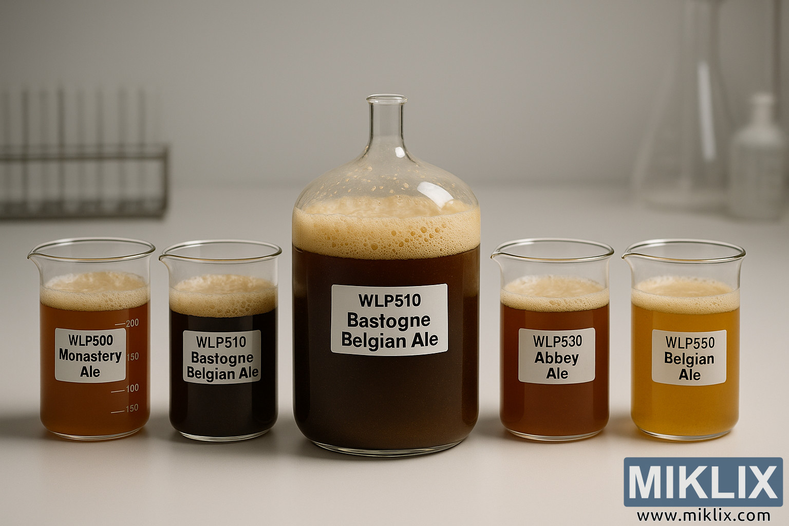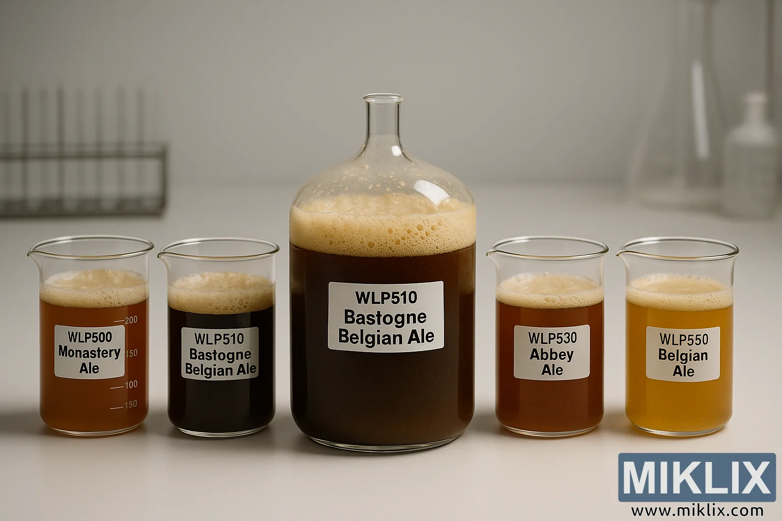 Në të dyja anët e enës Bastogne ndodhen dy gota më të vogla, secila e etiketuar qartë dhe e mbushur me mostra të ndryshme birre. Në të majtë, një gotë e shënuar me WLP500 Monastery Ale përmban një lëng me ngjyrë qelibar bakri. Shkuma e saj është më e lehtë, më e hollë dhe më pak e theksuar, duke reflektuar si karakteristikat e fermentimit të majasë ashtu edhe fazën e aktivitetit të kapur në këtë moment. Pranë saj, gota më e vogël WLP510 Bastogne Belgian Ale pasqyron tonet më të errëta të enës qendrore, por në një shkallë më të vogël, duke përforcuar temën e krahasimit dhe qëndrueshmërisë në të gjitha vëllimet e testimit.