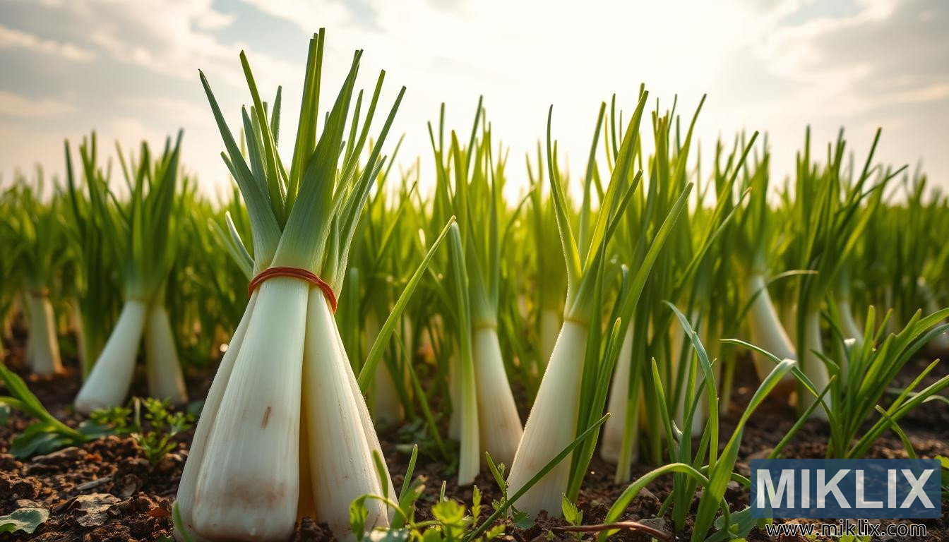 Fushë e gjallë me presh me kërcej të sapokorrur që shkëlqejnë nga vesa nën një qiell të artë pastel, duke simbolizuar bukurinë natyrore dhe përfitimet shëndetësore.