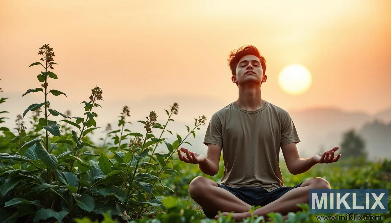 Imazhi kap bukur një moment qetësie dhe vetëanalize, duke ofruar një përfaqësim simbolik të përfitimeve të shëndetit mendor që lidhen me Ashwagandha-n. Në qendër, në plan të parë, ulet një individ i ri i zhytur në meditim, me këmbët e palosura në një pozë klasike joge, duart që mbështeten butësisht në gjunjë me pëllëmbët e hapura në një gjest pranimi. Sytë e tij janë të mbyllur, fytyra e tij e relaksuar dhe qëndrimi i tij i qëndrueshëm, duke rrezatuar një forcë të qetë që sugjeron ekuilibër dhe paqe të brendshme. Thjeshtësia e formës së tij bie ndesh me gjallërinë e mjedisit natyror përreth tij, duke përforcuar temën e harmonisë midis pranisë njerëzore dhe forcave shëruese të natyrës. Sjellja e tij pasqyron një gjendje qetësie që pasqyron vetitë lehtësuese të stresit dhe qetësuese që i janë atribuar prej kohësh Ashwagandha-s në traditën Ayurvedic.
