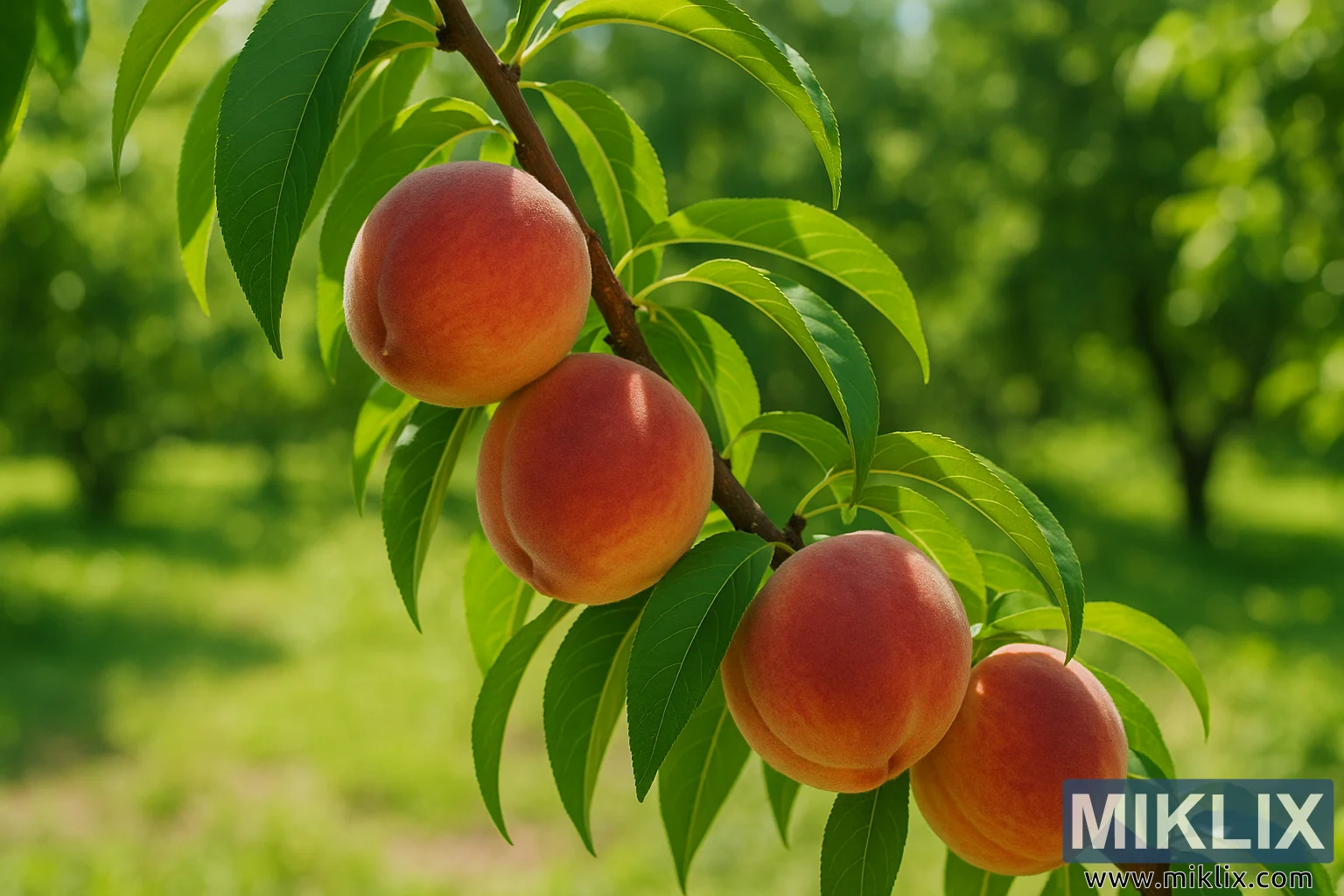 У благо замућеној позадини, протеже се бујна зелена боја воћњака, испрекидана бледим облицима других стабала окупаних топлом сунчевом светлошћу. Ефекат бокеха привлачи пажњу посматрача ка бресквама у првом плану, док истовремено одржава општи осећај светлог, отвореног баштенског простора. Светлост је несумњиво она сунчаног јутра или касног поподнева, са златном нијансом која појачава топлину и зрелост сцене.