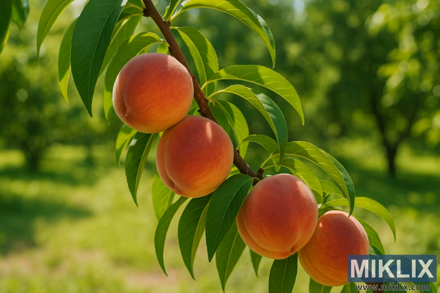 Живописан летњи призор зрелих брескви које светлуцају на сунцу, висе са лиснате гране у зеленом воћњаку испуњеном топлином и свежином.