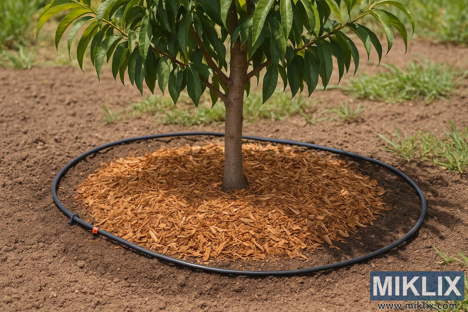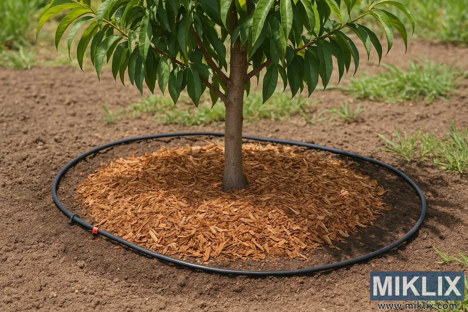 Фотографија високе резолуције која приказује младо стабло брескве са добро малчираном подлогом и ефикасним системом за наводњавање кап по кап, демонстрирајући најбоље праксе у очувању влаге у земљишту и одрживом управљању воћњаком.