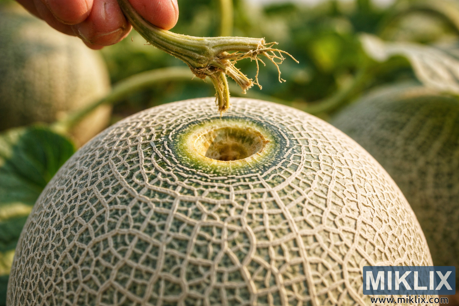 Слика приказује зрелу дињу у прецизној фази познатој као „пуно одвајање“, снимљену на веома детаљној, натуралистичкој фотографији. Композиција је усредсређена на врх диње, где се стабљика чисто одвојила од плода, остављајући за собом округли, благо удубљени ожиљак. Овај ожиљак делује влажно и глатко, са бледо жутом до светлозеленом бојом која благо контрастира са околном кором. Површина диње је прекривена густом, подигнутом мрежом беж мреже постављене преко пригушене зелене позадине, наглашавајући и текстуру и зрелост. У горњем делу кадра, људска рука лагано држи одвојену стабљику. Сама стабљика изгледа суво и влакнасто на сломљеном крају, са танким, кончастим влакнима која се шире ка споља, визуелно појачавајући идеју да се плод природно одвојио, а не да је исечен. Рука је делимично видљива, приказујући врхове прстију са природном текстуром коже и суптилним траговима прљавштине, што сугерише недавну бербу на пољу. Позадина је благо замућена, откривајући назнаке зелених лоза, лишћа и додатних диња које леже на земљи, што пружа пољопривредни контекст без одвлачења пажње од главног субјекта. Осветљење је топло и природно, вероватно сунчева светлост, бацајући нежне рефлекторе преко мрежасте коре и меке сенке у ожиљак стабљике, појачавајући дубину и реализам. Генерално, слика функционише као едукативни и илустративни приказ оптималне зрелости диње, јасно демонстрирајући индикатор пуног клизања који користе узгајивачи и баштовани за одређивање времена врхунца бербе. Мала дубина поља, реалистичан баланс боја и крупни план комбинују се како би створили визуелно информативан и естетски пријатан приказ тренутка када је диња савршено спремна за брање.
