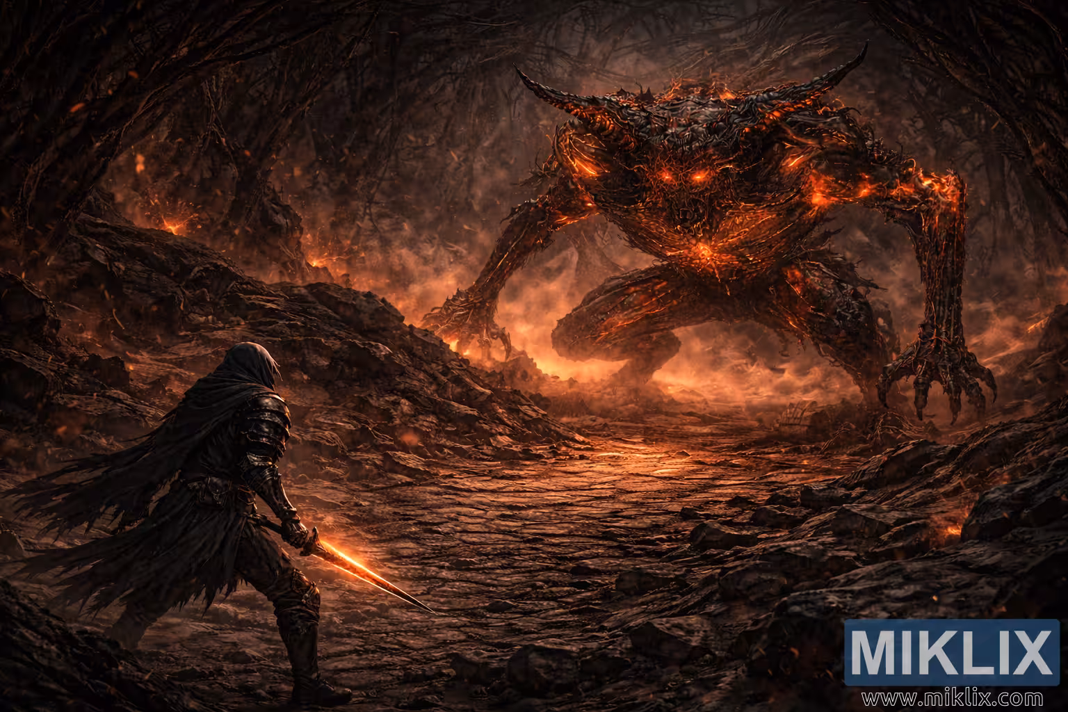 Дигитална слика мрачне фантазије представља напети сукоб пре битке из повучене, уздигнуте изометријске перспективе, омогућавајући да се у потпуности цене и огромно окружење и разлика у размери између две фигуре. Посматрачева тачка гледишта лебди изнад и мало иза усамљеног оклопљеног ратника, који заузима доњи леви део композиције. Са ове висине, ратник делује мањи и рањивији, наглашавајући изолацију и огромну величину противника испред. Фигура је обучена у слојевити, изношени оклоп од тамног челика и коже, површине су тупе од чађи и хабања, а не од полираног сјаја. Тешки плашт пребацује се преко рамена и вуче се иза, његов поцепани руб и дебели набори сугеришу тежину и дуготрајну употребу. У ратниковој десној руци, мач светли уздржаном растопљеном оштрицом, светлост је суптилна и реалистична, подсећа на загрејани метал који рефлектује паклени сјај пећине, а не на преувеличани магични зрак. Став је опрезан и утемељен, стопала су на напуклом камену, торзо нагнут напред као да мери удаљеност и време.