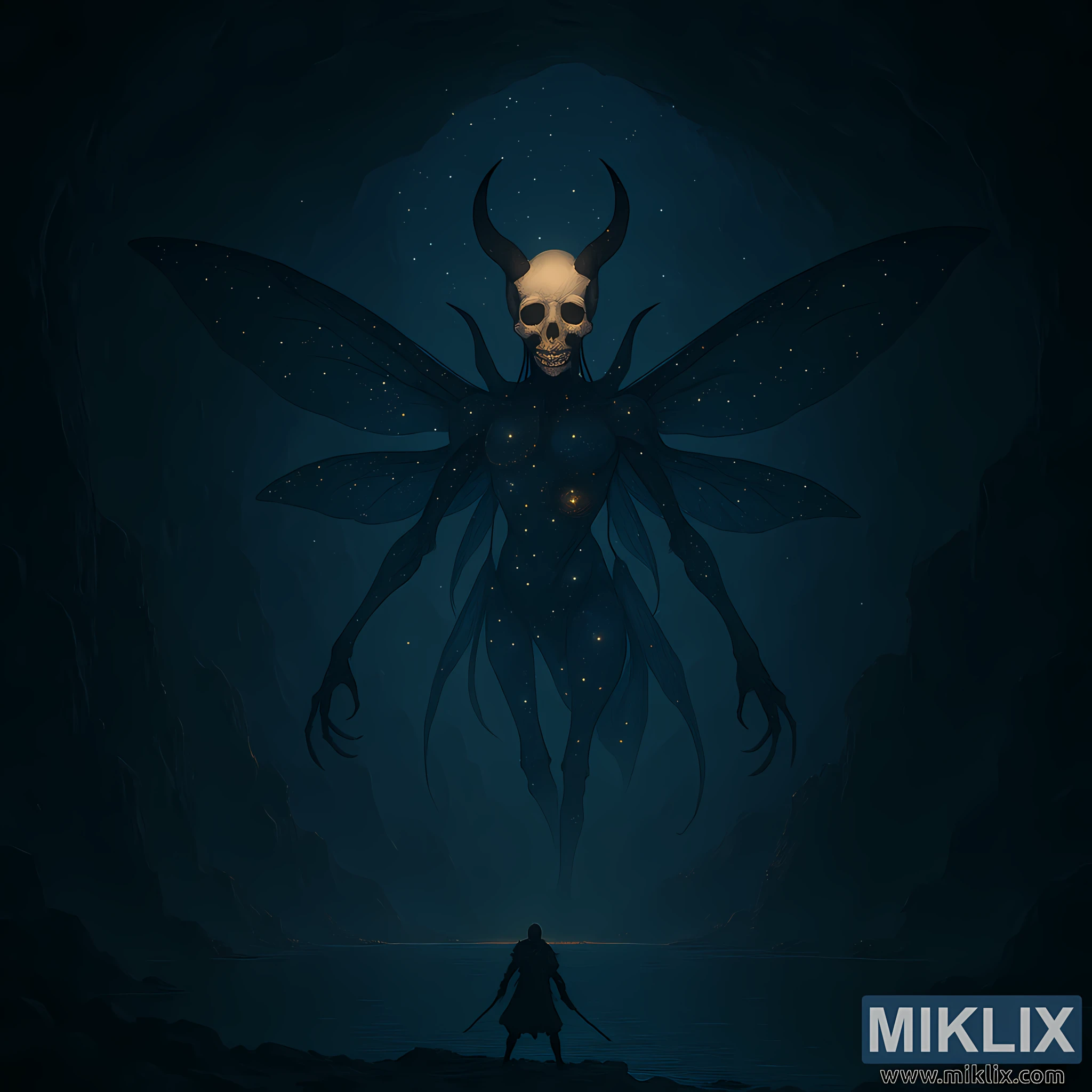 Мрачна фантастична сцена у којој се усамљени ратник суочава са огромним небеским инсектом са рогатом лобањом у огромној подземној пећини.