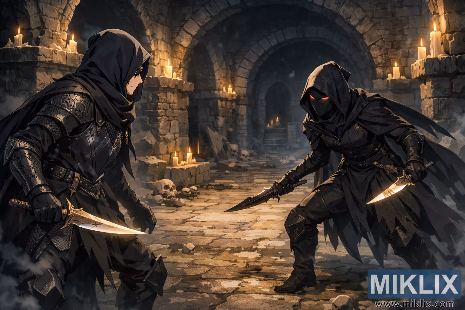Насупрот њима, Убица Црни Нож израња из таме са слично огртачем огртачем, витке и окретне фигуре. Одећа убице је још тамнија, готово се стапа са позадинским каменим зидом, са само суптилним истакнутим детаљима набора тканине и ивица оклопа који откривају њихове обрисе. Њихов став је нижи и предаторскији, једном ногом напред и торзом под углом као да се спремају да ударе у тренутку. Закривљена оштрица светлуца бледом ћилибарном нијансом, одражавајући оружје Потамњелог, али зрачећи злокобнијом енергијом. Очи убице изгледају слабо осветљене испод капуљаче, стварајући језиву фокусну тачку која привлачи пажњу посматрача.