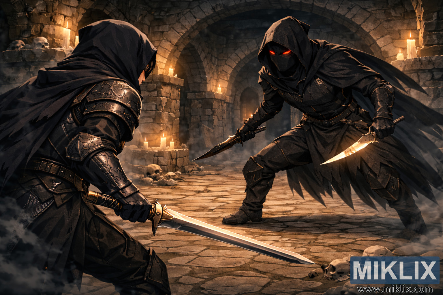 Десном страном композиције доминира Убица са Црним Ножем, приказан у приметно већој размери која одмах ствара осећај претње и неравнотеже. Силуета убице је широка и импозантна, умотана у слојевиту црну одећу и оклоп који се готово стапају са околним сенкама зидова катакомби. Дубока капуљача скрива већину црта лица, али два живописна гримизна ока светлуцају испод тканине, стварајући језиву фокусну тачку која привлачи пажњу и појачава напетост. Убица чучи у предаторском ставу са савијеним коленима и трупом нагнутим напред, изгледајући спреман да сваког тренутка скочи. У свакој руци држи закривљени бодеж који емитује слаб ћилибарни сјај, а њихове оштре ивице хватају светлост свеће и стварају оштре металне рефлекторе који су у контрасту са равним мачем Потамњелог. Преувеличана разлика у величини појачава осећај опасности и наглашава неравнотежу моћи пре него што се изврши први ударац.