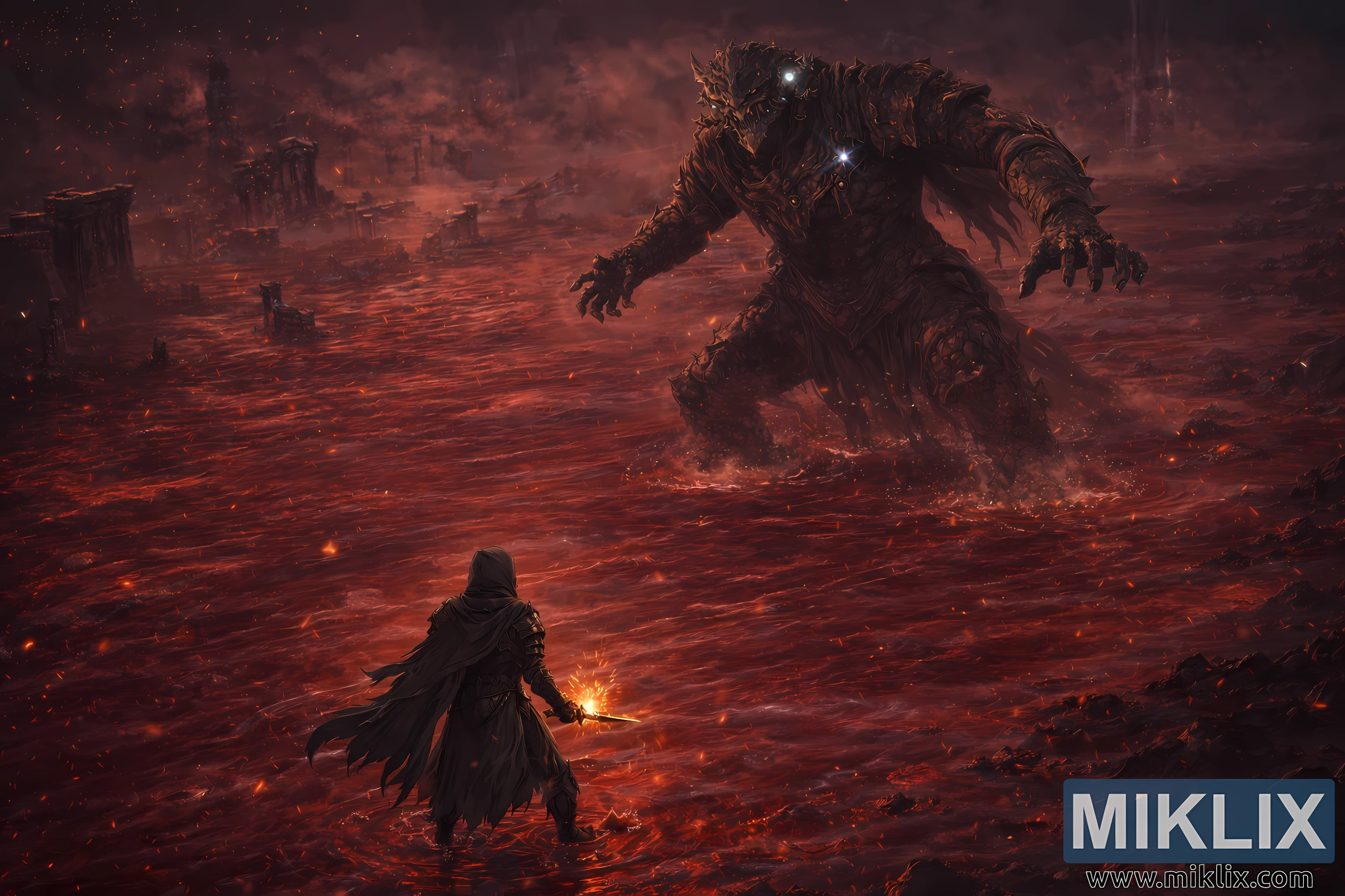 Слика приказује мрачну фантастичну бојну сцену инспирисану филмом Елден Ринг, приказана у реалистичном, сликарском стилу који минимизира преувеличане или цртане карактеристике. Тачка гледишта је подигнута и благо повучена уназад, стварајући изометријску перспективу која открива и борце и непријатељско окружење које их окружује. Језеро трулежи доминира пејзажом, његова површина је густо, узбуркано пространство дубоко гримизне течности која рефлектује пригушене, ватрене одсјаје. Језеро делује вискозно и искварено, са таласима, прскањем и ужареним жаром који лебди по површини, појачавајући осећај токсичности и пропадања. Густа црвена магла виси ниско изнад воде, делимично заклањајући удаљене детаље и дајући сцени загушљиву, угњетавајућу атмосферу.