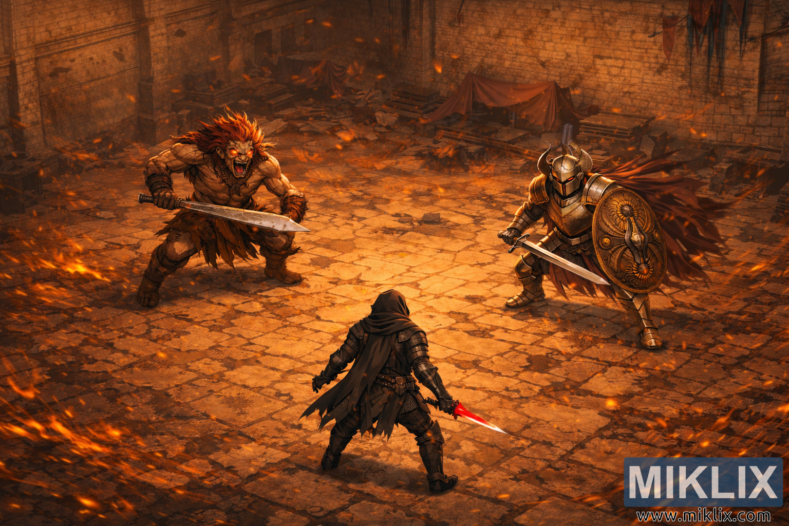 Окружење уоквирује сукоб богатим детаљима. Под дворишта је мозаик поломљених камених плочица, расутих остатака и мрља ужареног жара које формирају грубу кружну границу око бораца. У позадини се надиру високи зидови замка, прекривени поцепаним заставама и опуштеним конопцима. Напуштени шатори, разбијени сандуци и срушене дрвене конструкције нижу се по ивицама, наговештавајући опсаду замрзнуту у времену. Ваздух је густ од дима и лебдећих варница, а цела сцена је обасјана топлим наранџастим и златним тоновима од невидљивих ватри иза зидина.