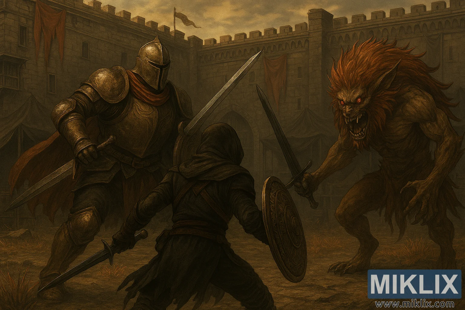Веома детаљна дигитална слика приказује сцену унутар зидина древне тврђаве где се ратник са капуљачом суочава са тешко оклопљеним витезом и монструозним створењем. Двориште тврђаве има рушевне камене зидове, лучне зубце и поцепане црвене заставе које висе са стубова. Зидови су истрошени, са мрљама маховине и прљавштине. Дрвене скеле су видљиве са леве стране, заједно са шаторима и импровизованим склоништима прекривеним тамном, истрошеном тканином у позадини. Земља је посута сувом травом, земљом и мрљама поломљеног камена.